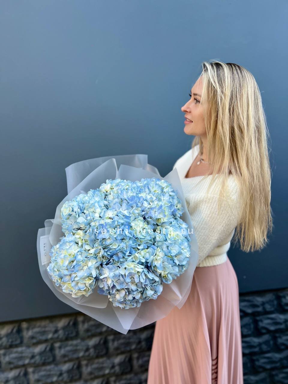 Семь соцветий голубой гортензии образуют воздушную композицию с прохладным характером. Редкий оттенок и крупные шапки цветов притягивают взгляд и освежают пространство.