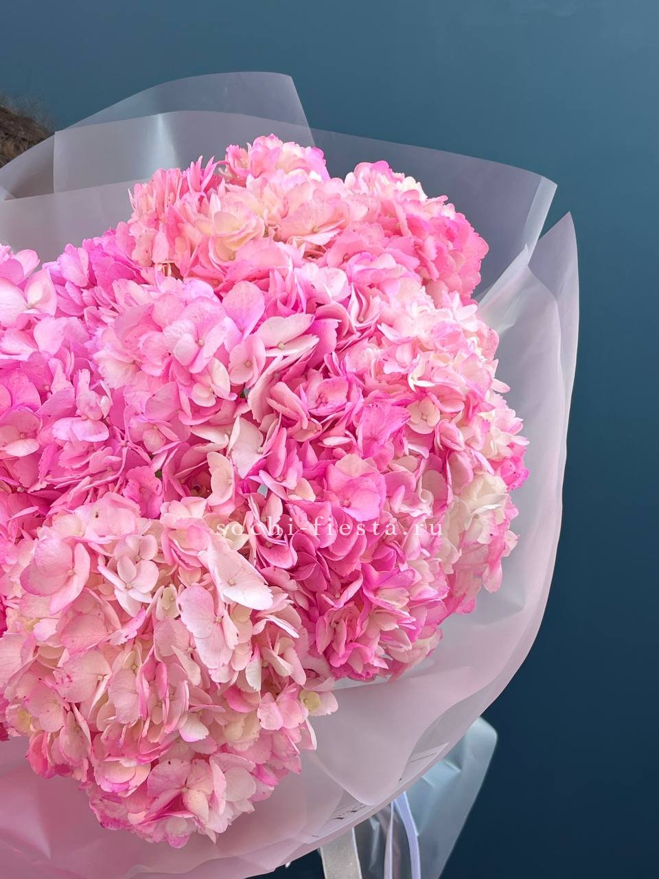 Семь крупных соцветий насыщенного розового оттенка собраны в плотный букет с выразительным силуэтом. Каждая гортензия раскрывает объёмную шапку лепестков, создавая впечатляющее присутствие в любом пространстве.