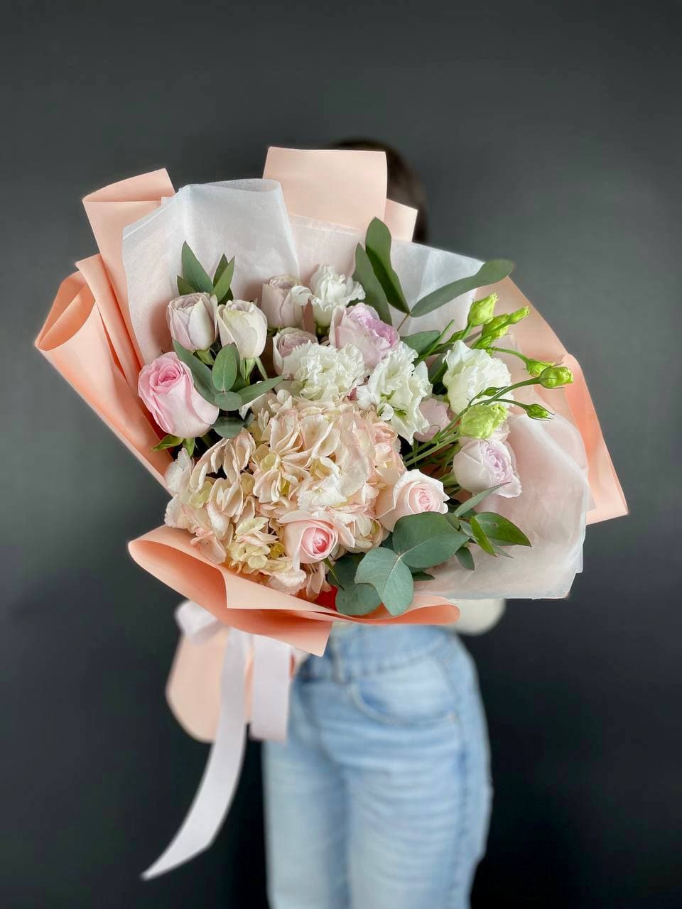 гортензия нежно-розовых оттенков, эустома, львиный зев или маттиола, розовые розы, эвкалипт, вспомогательная зелень, лента, светлая корзин.