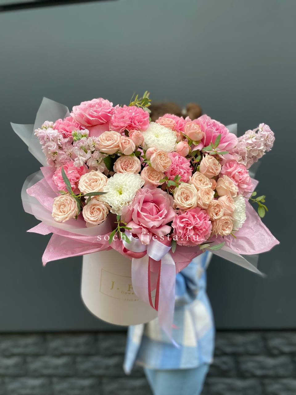Настоящий цветочный фейерверк в стильной коробке! Эта пышная и многосоставная композиция притягивает взгляды богатством форм и оттенков — от кремового и персикового до насыщенного розового и белого. Это не просто цветы, а целая история о радости, празднике и восхищении. Подарок, который гарантированно произведет яркое впечатление и останется в памяти надолго.