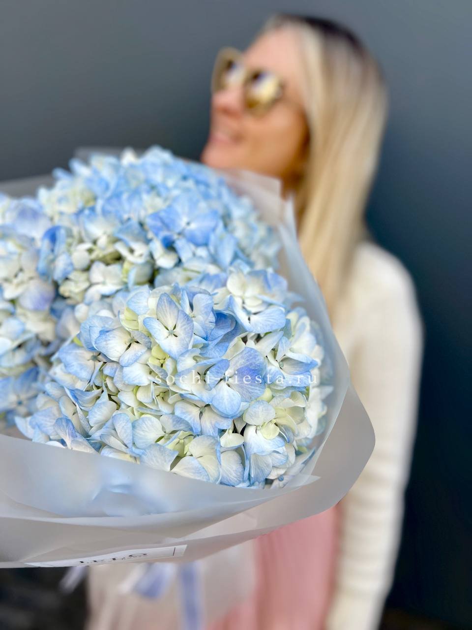 Три пышных шапки голубой гортензии образуют округлую форму с естественной асимметрией. Каждое соцветие раскрыто полностью, создавая впечатление объёмного облака в руках.