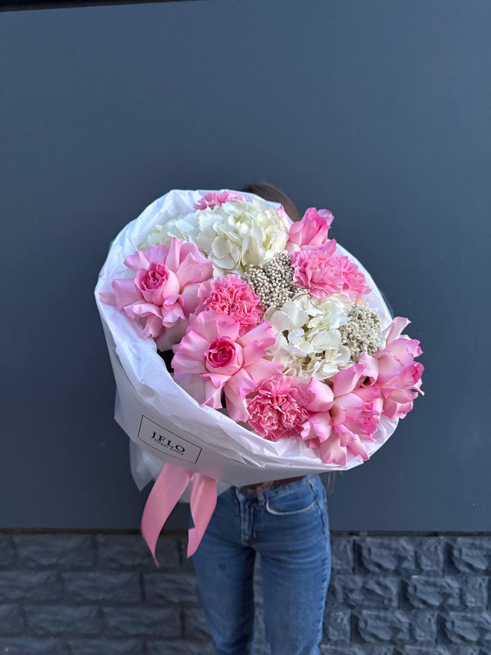 Розовые розы раскрываются среди воздушных соцветий гортензии и мелких бутонов диантуса. Озотамнус добавляет композиции лёгкость и объём. Букет собран плотно и держит форму без лишних деталей.