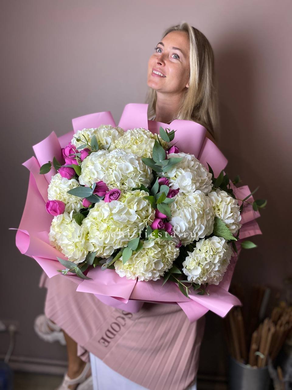 Пышная гортензия обволакивает кустовые розы Мисти Баблс, создавая плотную текстуру с переходами от ягодного к лавандовому. Каждый бутон раскрыт по-своему, образуя живую композицию с глубиной и объёмом.