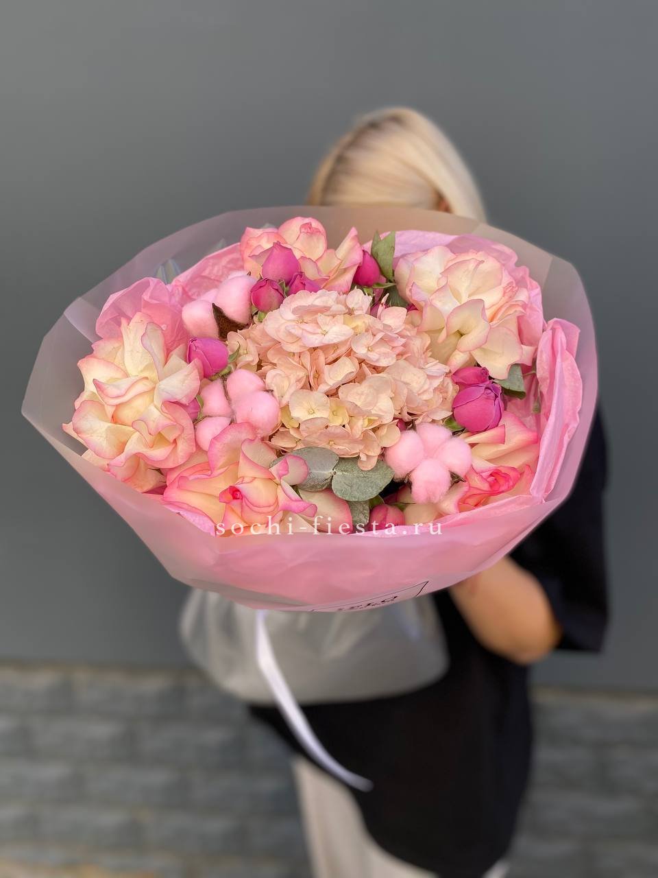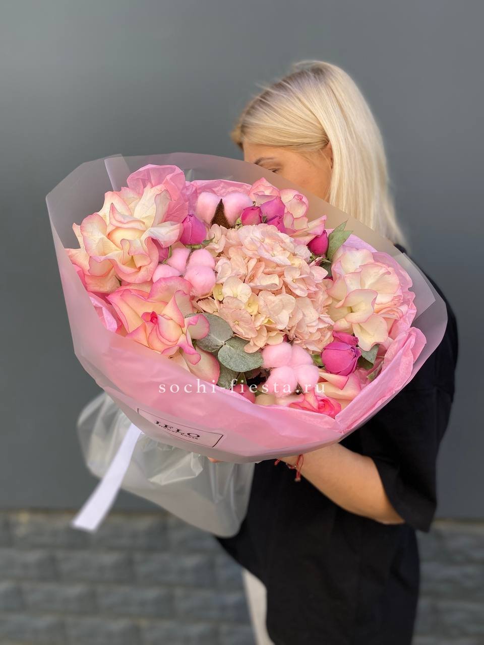 гортензия белая, роза одноголовая, роза кустовая, пионовидная роза Мисти Баблс, эустома тишью, упаковка, лента.