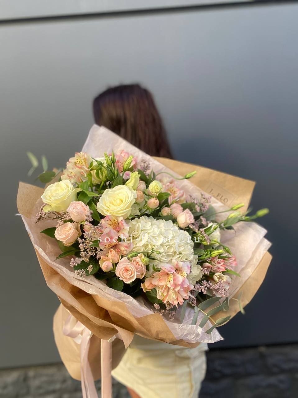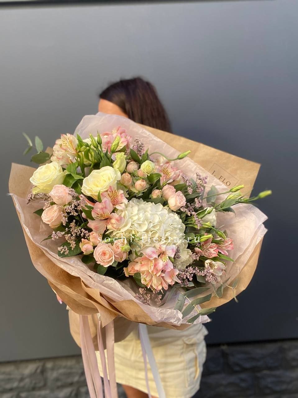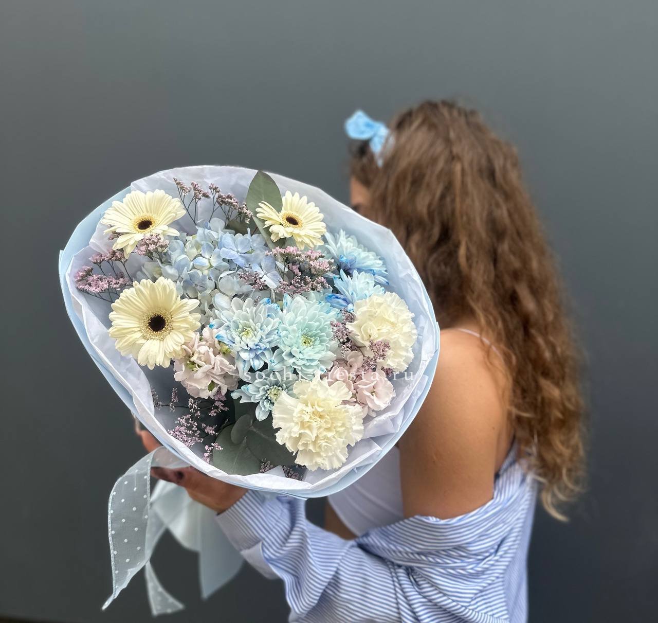 Плотная сборка с пышными соцветиями гортензии и яркими герберами создает объемный силуэт. Маттиола и лимониум добавляют воздушности по краям, а диантусы заполняют центр мягкими переходами.
