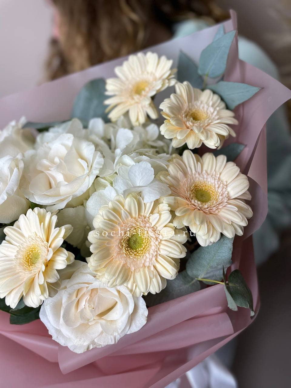 гортензия, кустовые хризантемы, герберы, маттиола, диантусы и лимониум.