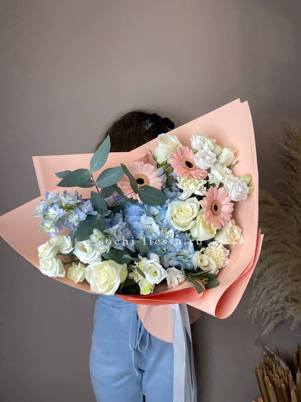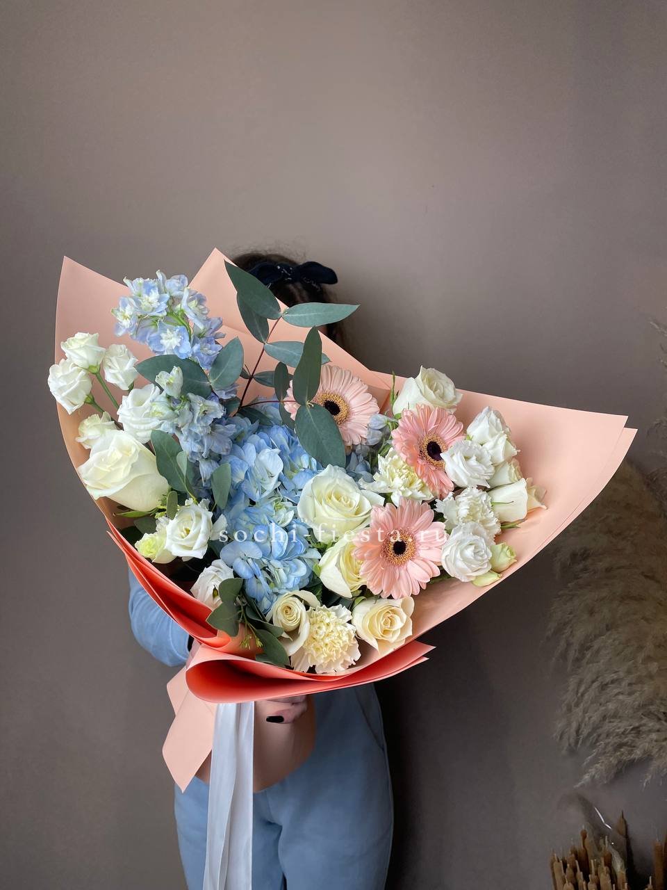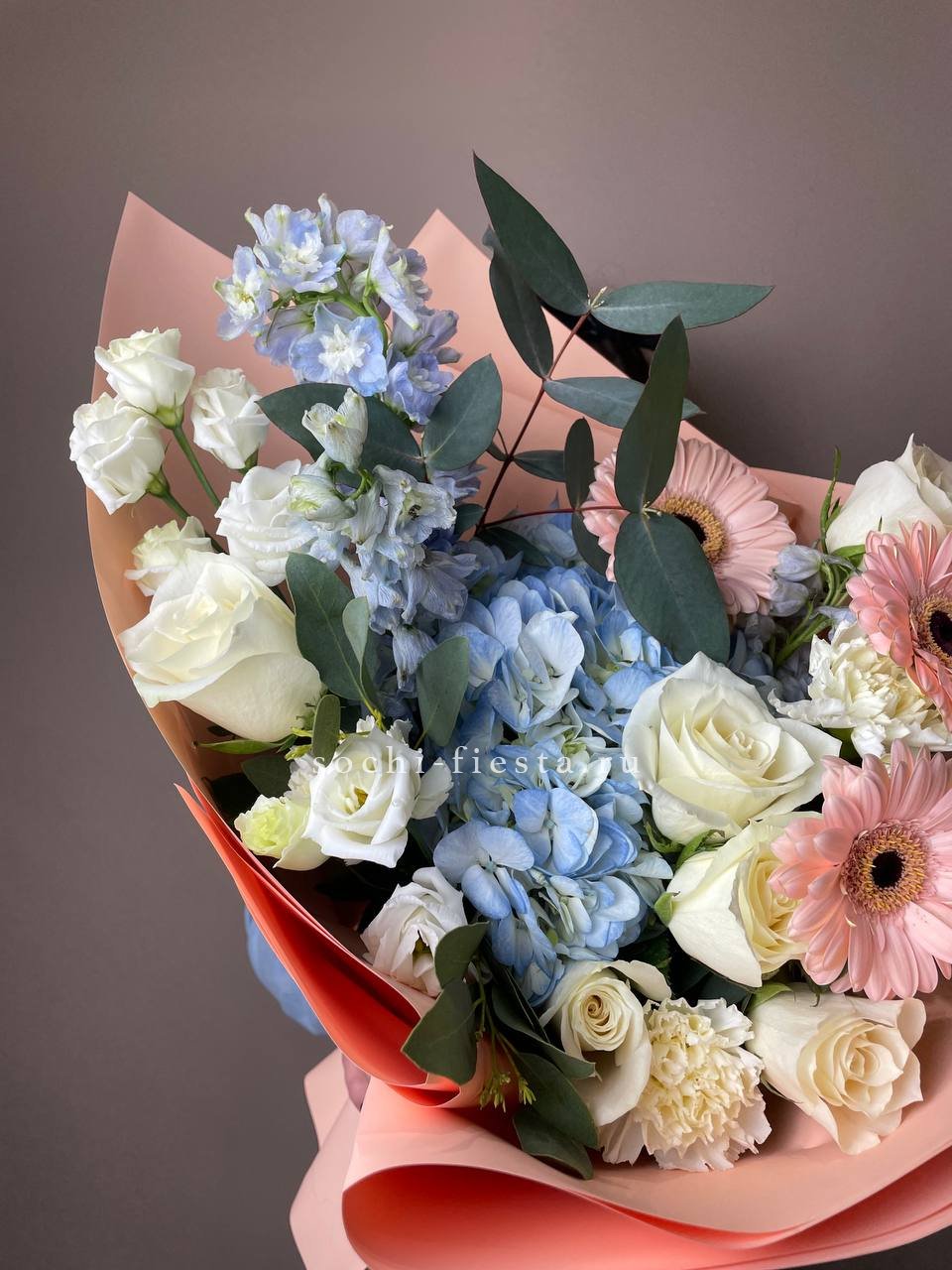 гортензия, роза, гербера, эустома, диантус, дельфиниум, эвкалипт, лента, дизайнерская пленка.
