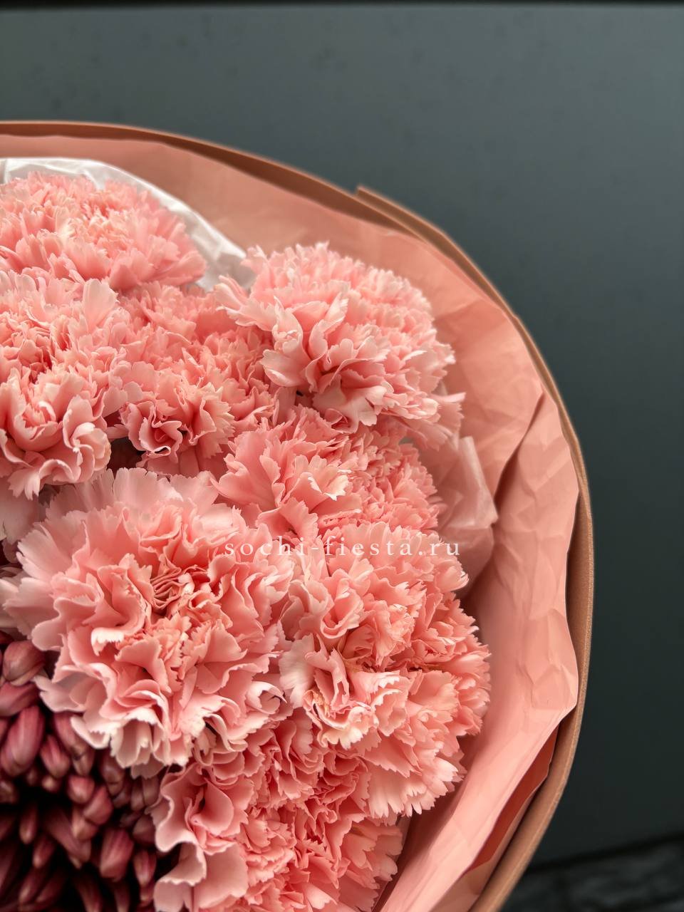 Кудрявые головки хризантем Бигуди и яркие диантусы создают весёлый ритм. Плотная сборка и дизайнерская упаковка превращают букет в готовое решение для встречи.