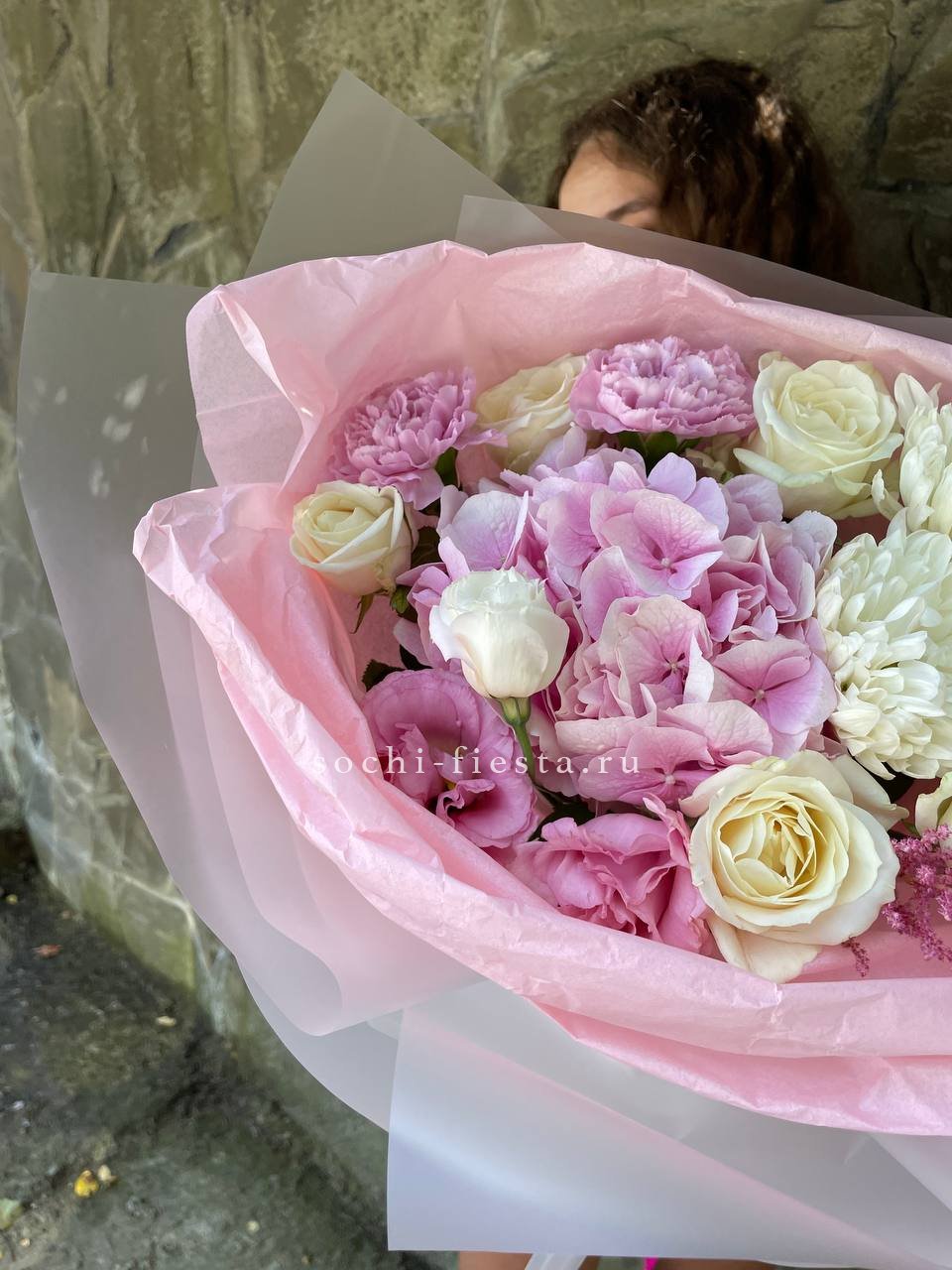 Пионы и эустома собраны в свободную форму где каждый бутон раскрывается в своём ритме. Маттиола и чико дополняют букет мягкими линиями и природной непринужденностью.