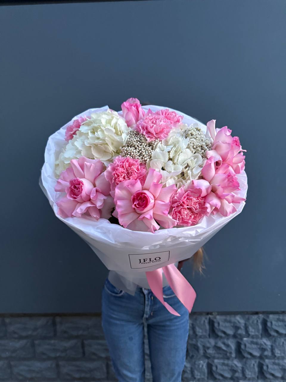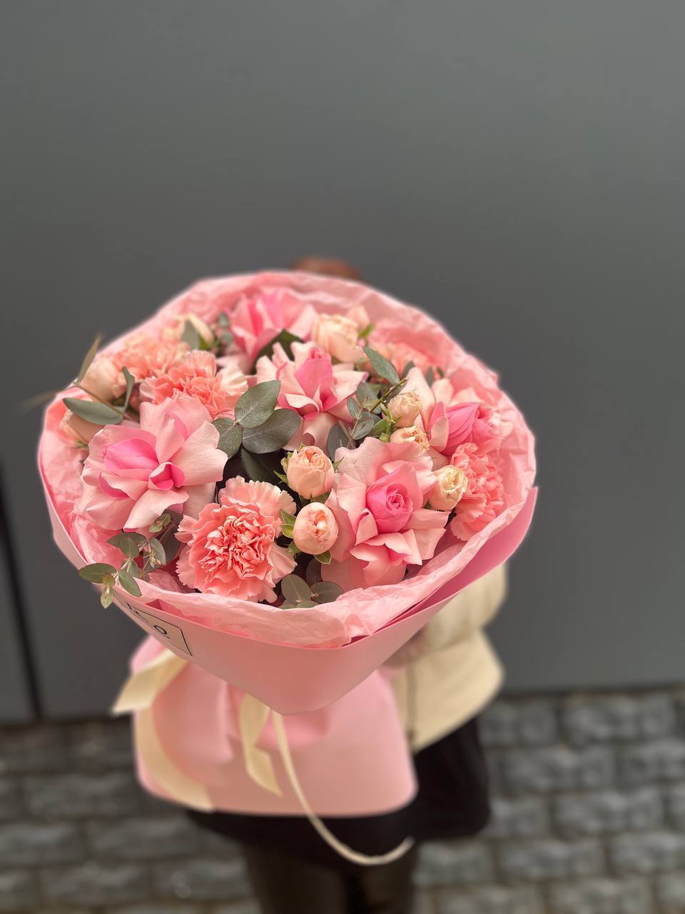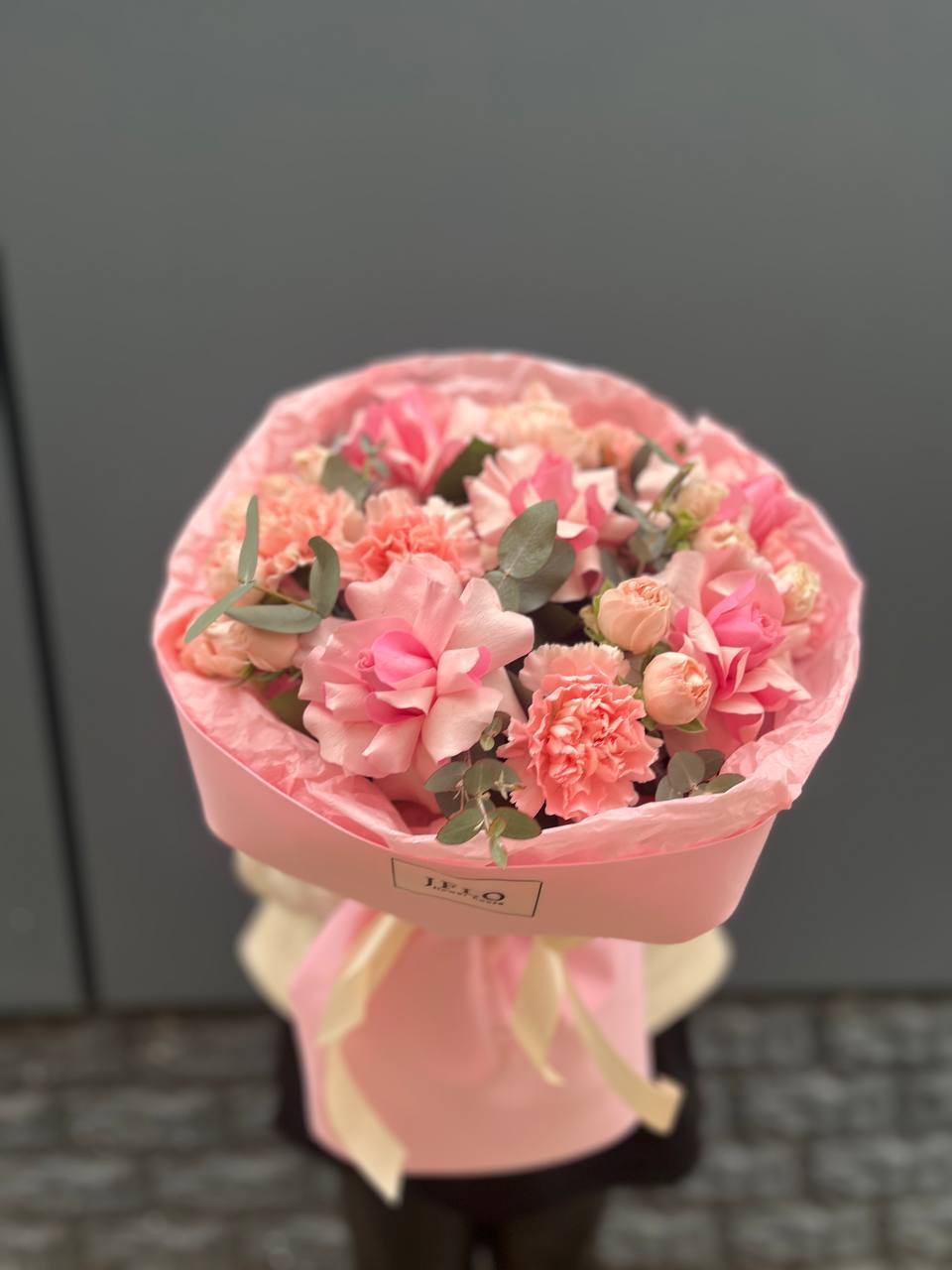 Хризантемы и розы переплетаются с диантусом и озотамнусом в букете насыщенных красок. Каждый цветок раскрывается по-своему, наполняя композицию движением и жизнью.