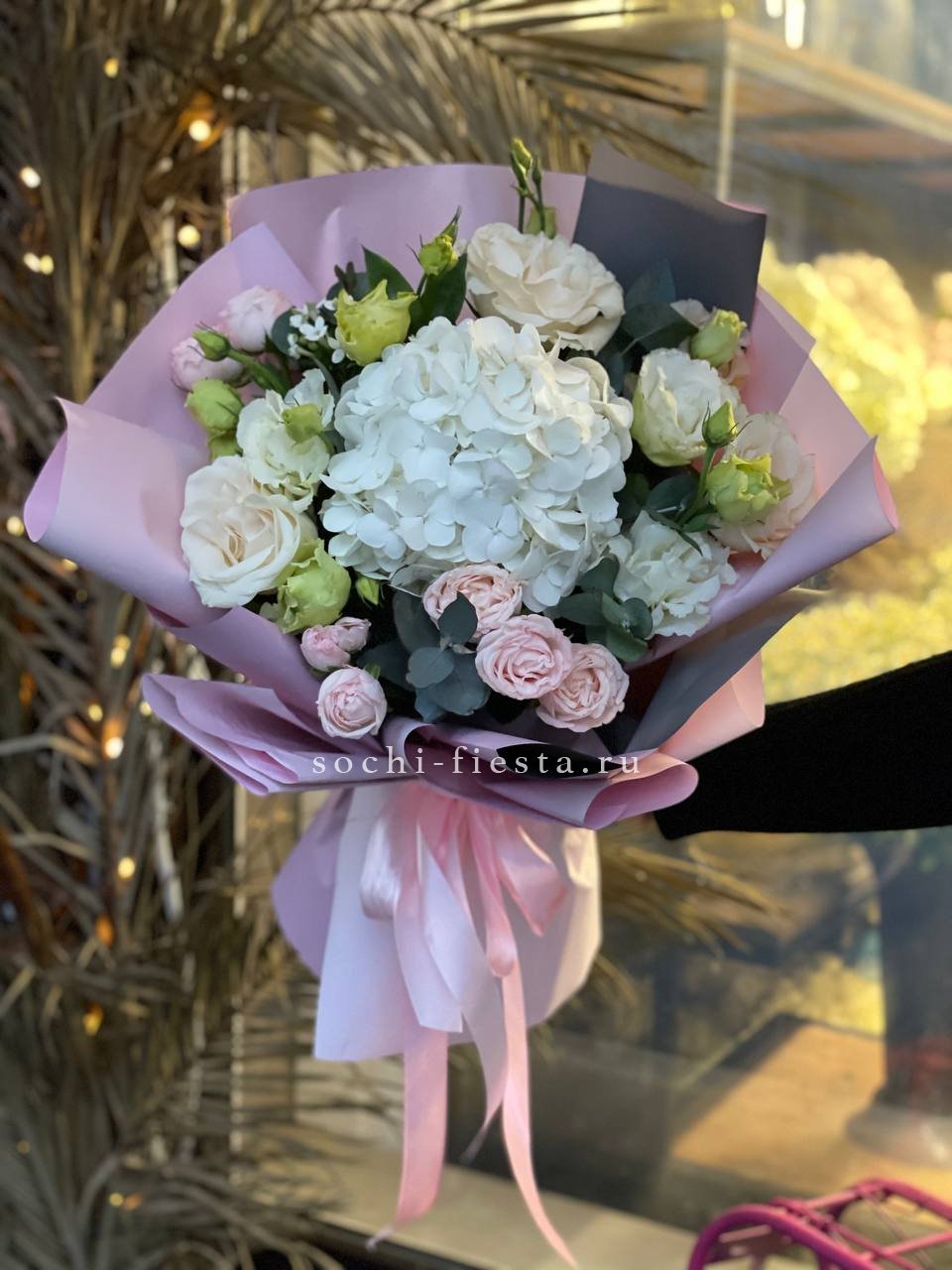 гортензия, мисти баблс, джумилия, эвкалипт, хлопок, упаковка.