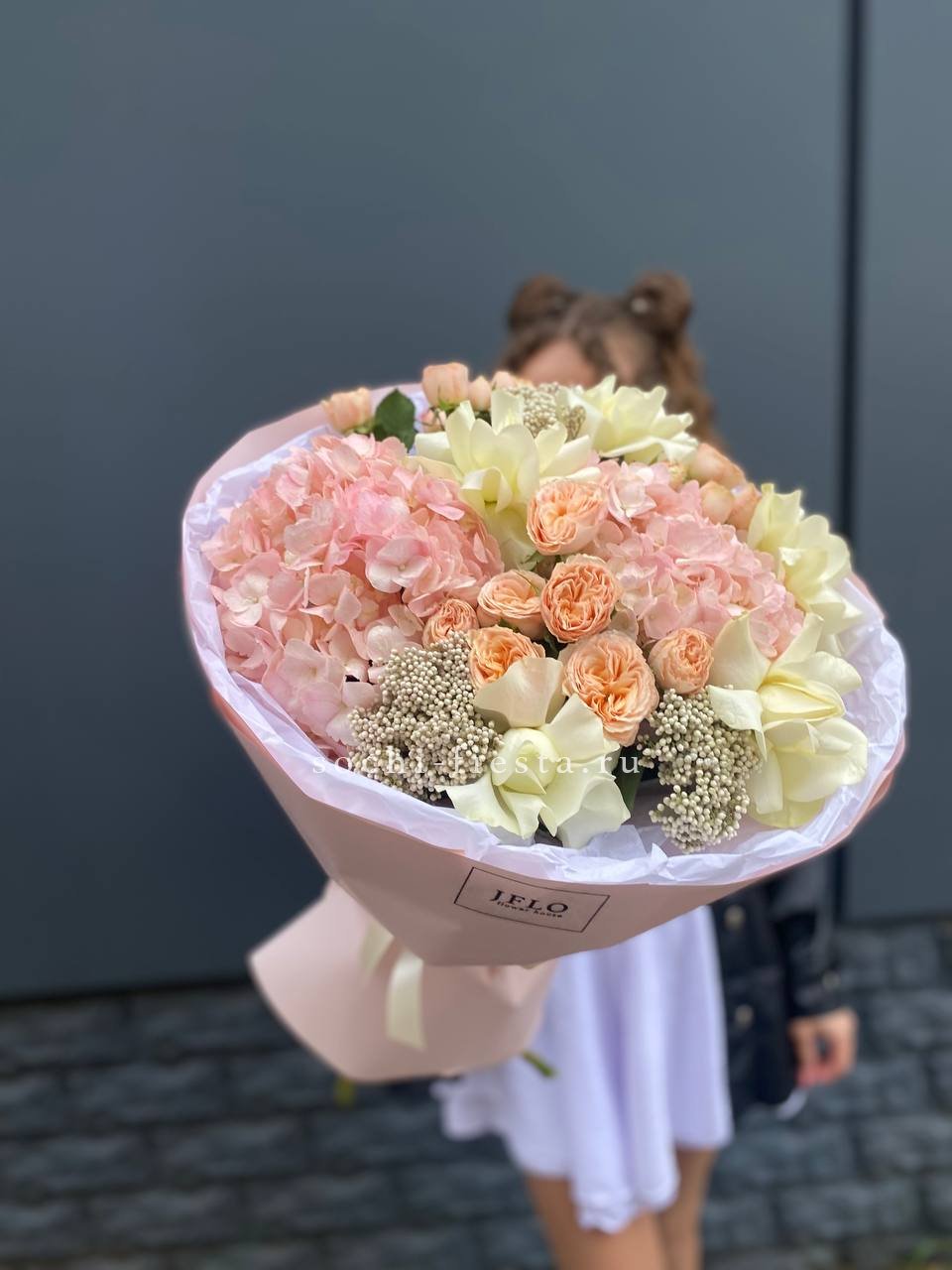 гортензия, пионовидная роза, озотамус, белая роза в нежном оформлении.