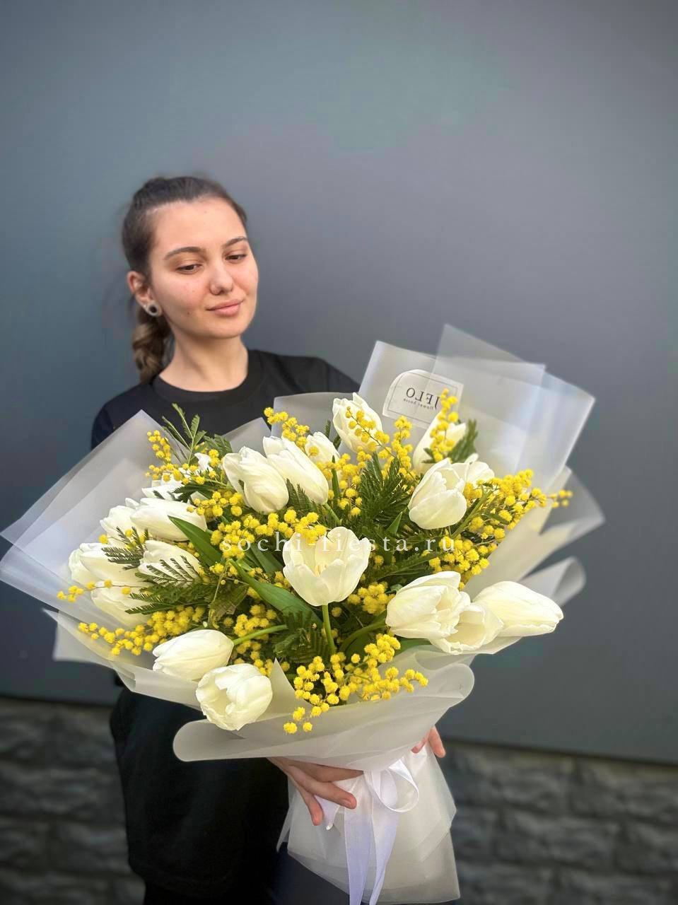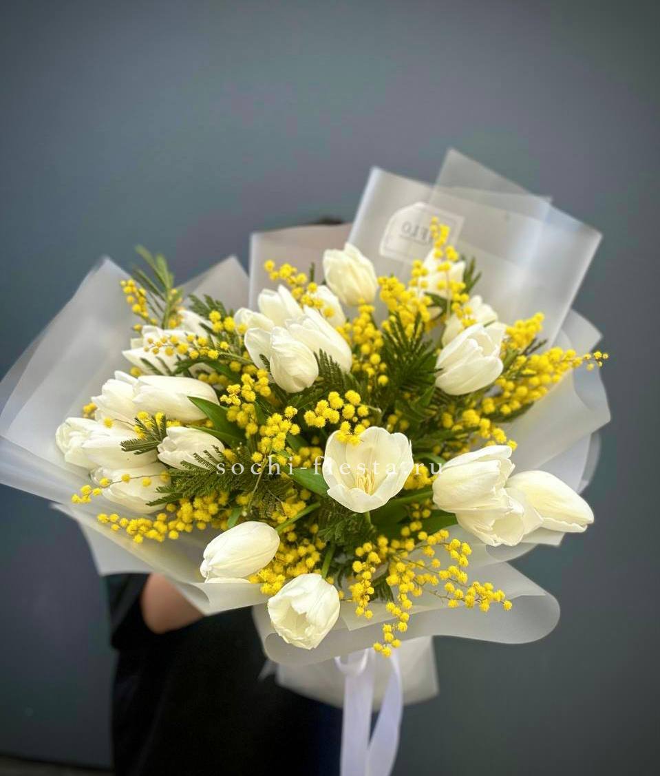 тюльпаны 25шт, мимоза, оформление.