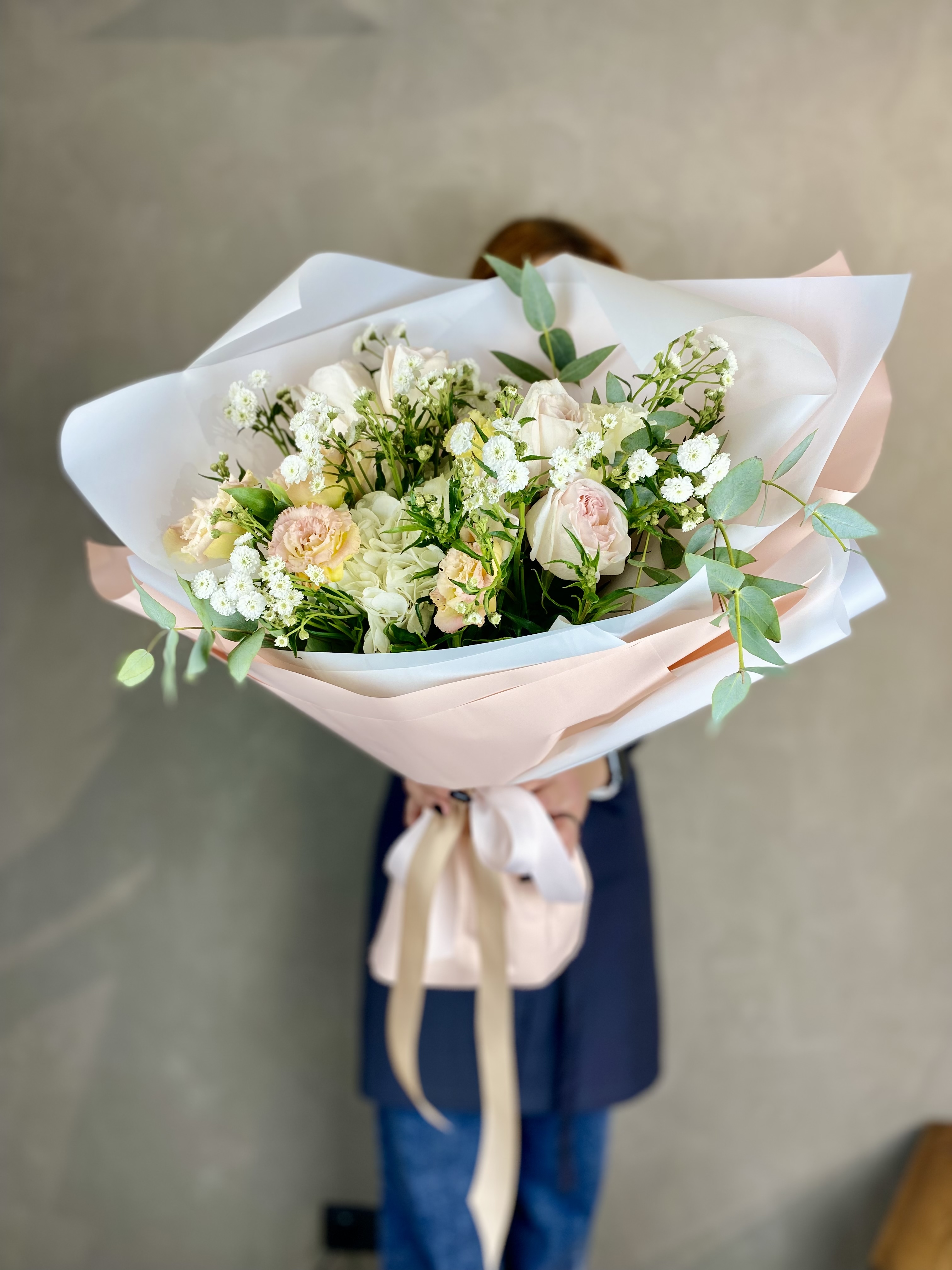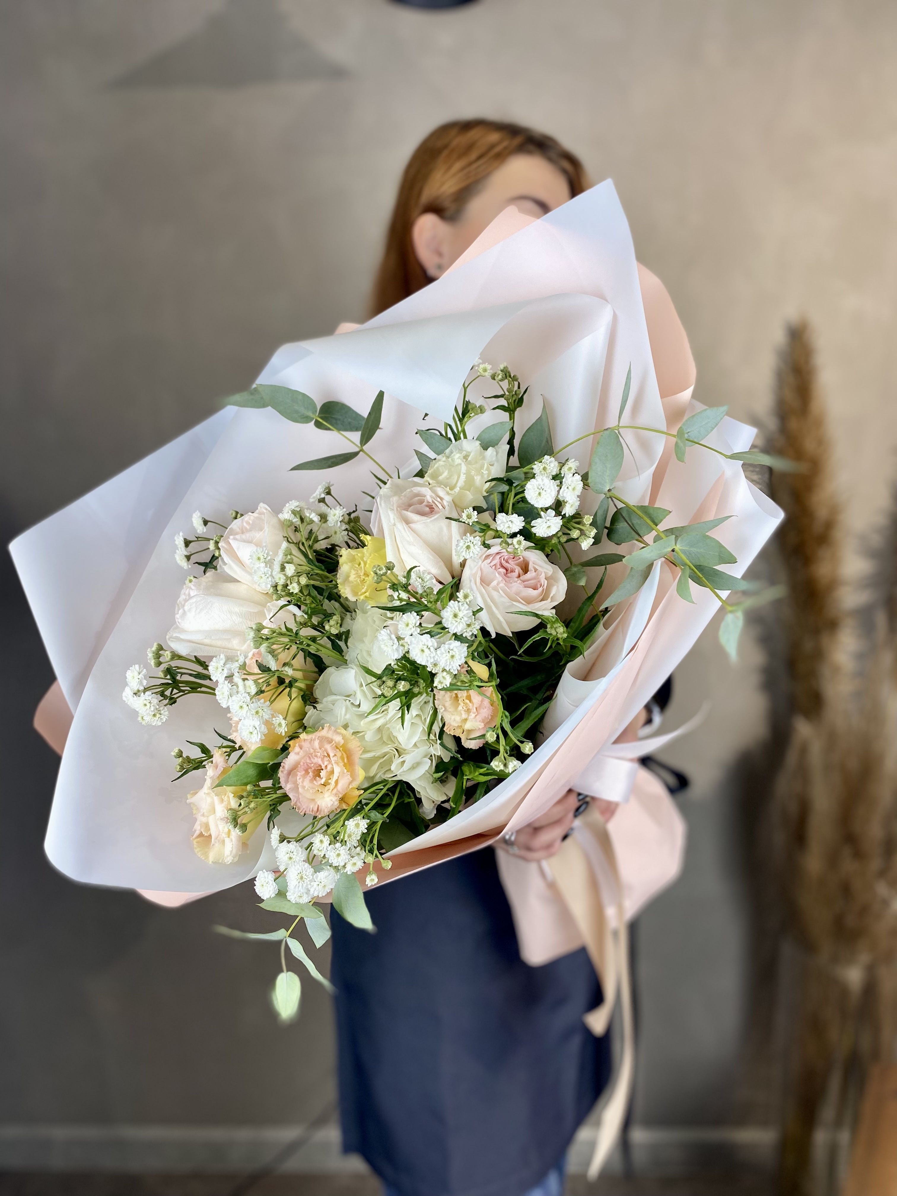 Пионовидные розы раскрываются широкими бутонами среди воздушных соцветий гортензии и многолепестковой эустомы. Эвкалипт добавляет свежести линиям, а дизайнерская упаковка завершает композицию.