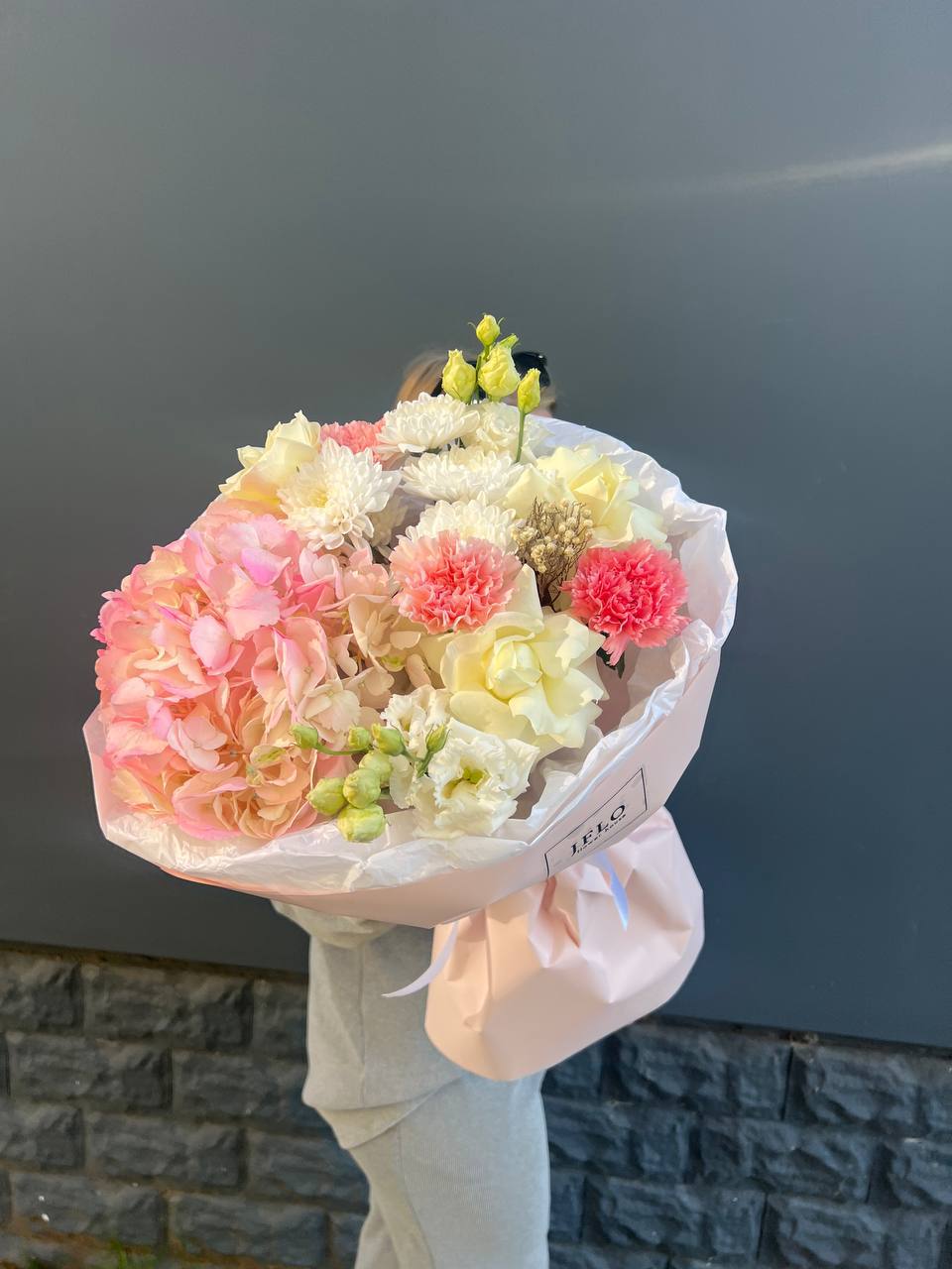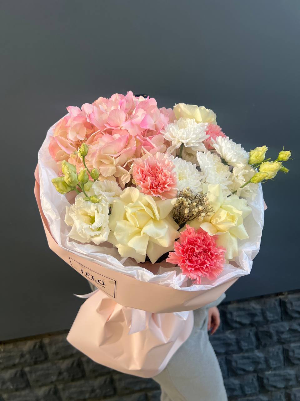 Пышная композиция в розово-персиковой гамме с объемными бутонами пионов и соцветиями гортензии. Маттиола добавляет воздушность, а дизайнерская упаковка завершает образ.