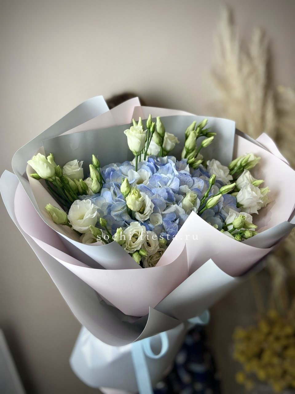 гортензия, розы, диантусы, хризантема, пионы (или пионовидные розы), эустома, корзина. Состав может меняться, в зависимости от сезона.