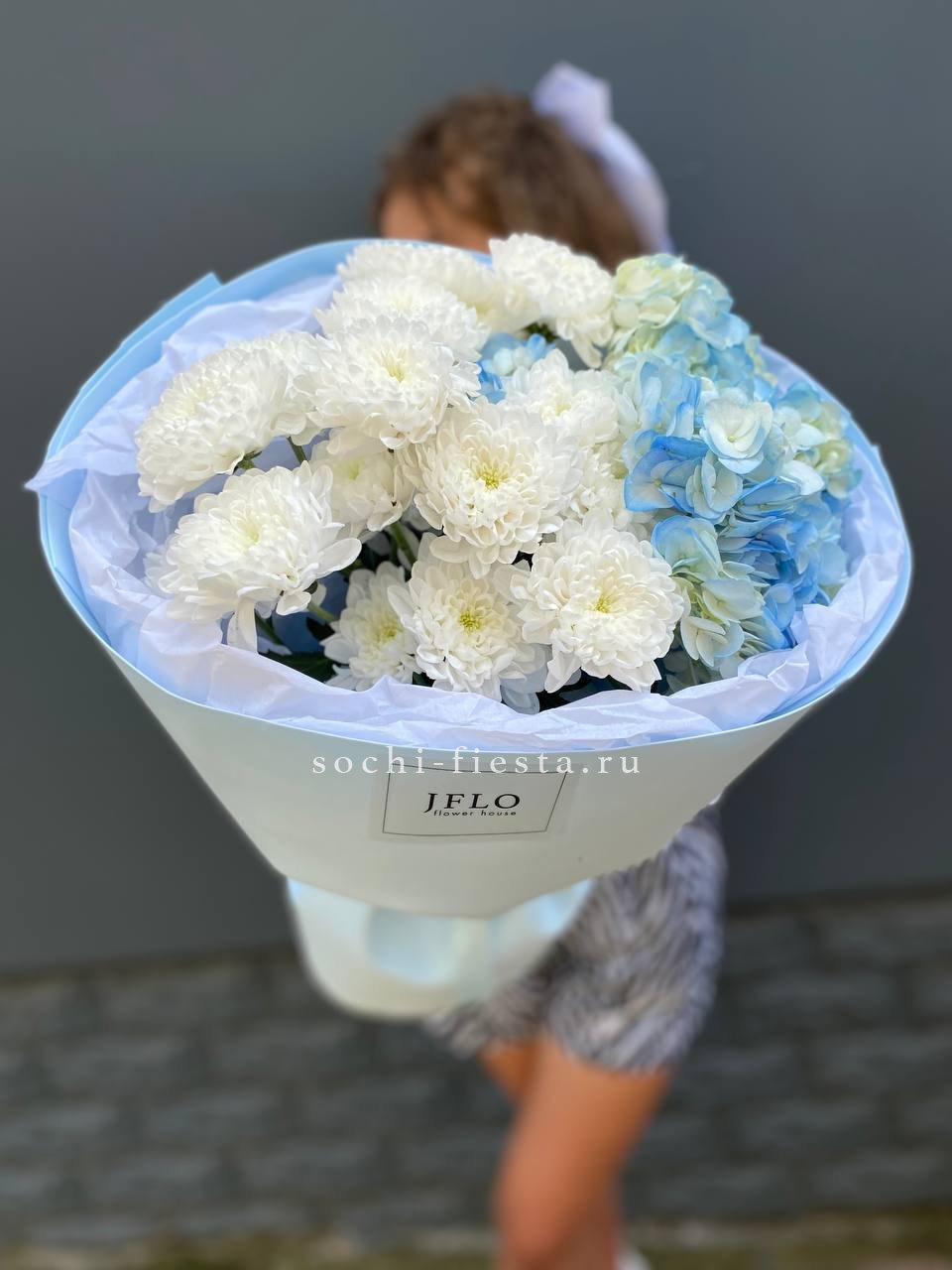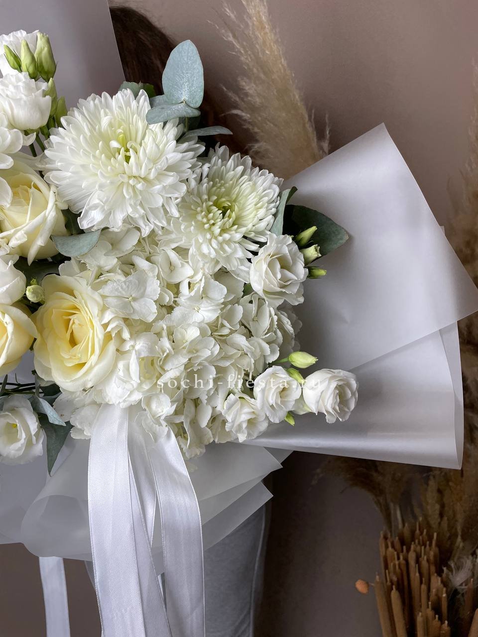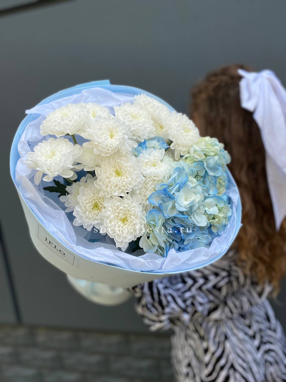 гортензия, пионовидная кустовая роза Мисти Баблс, лента, дизайнерская упаковка.