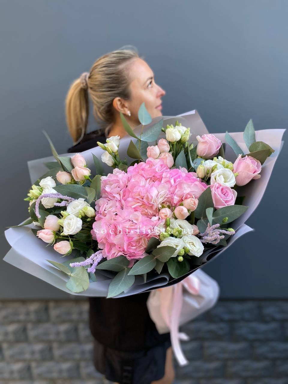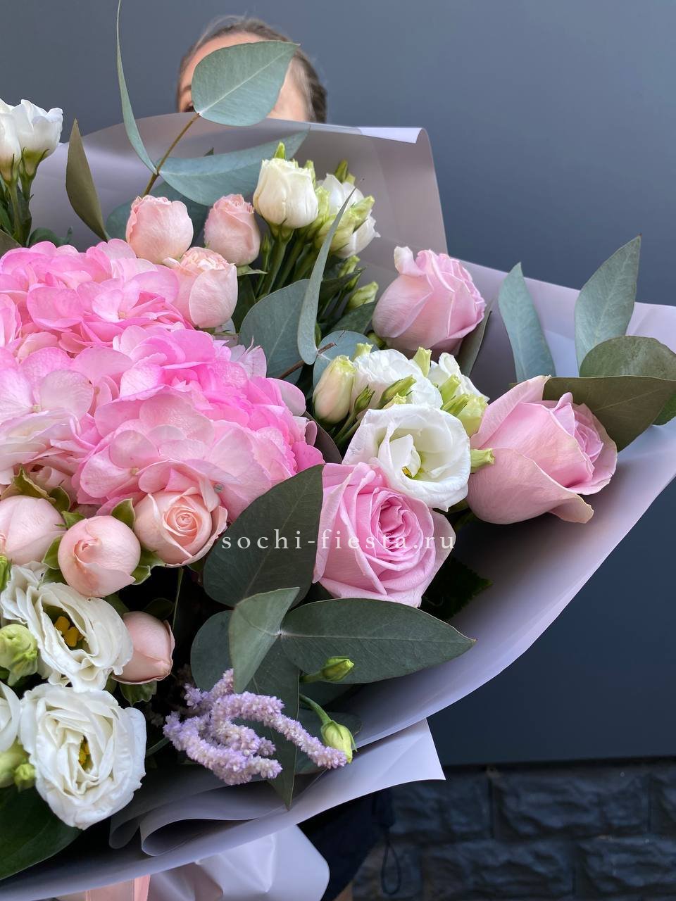гортензия, бруния или замена, эустома, герберы, розы, аспарагус, эвкалипт, дизайнерское оформление.