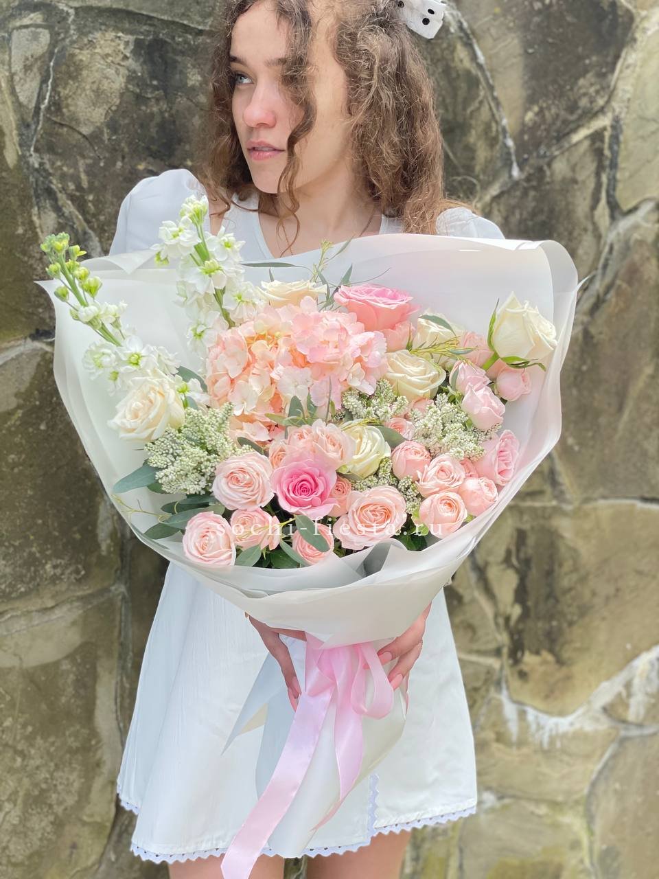 Пышная гортензия задает объем, а розы и матtiола выстраивают живописную глубину композиции. Вероника добавляет вертикальные линии, эвкалипт смягчает переходы между соцветиями. Букет с продуманной архитектурой и авторским почерком.