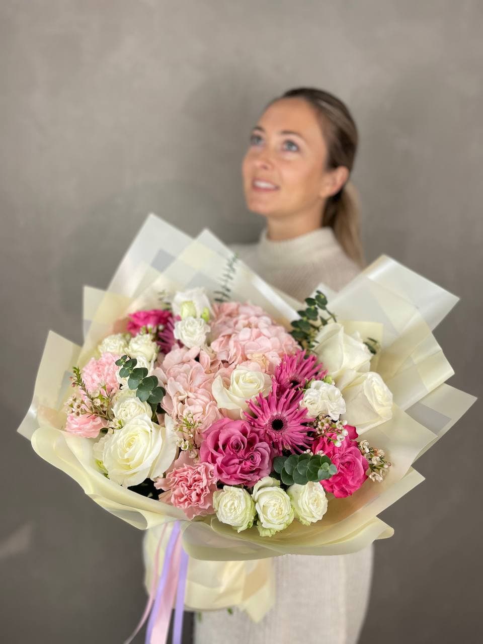 Букет собран вручную с учётом баланса объёма и деталей.