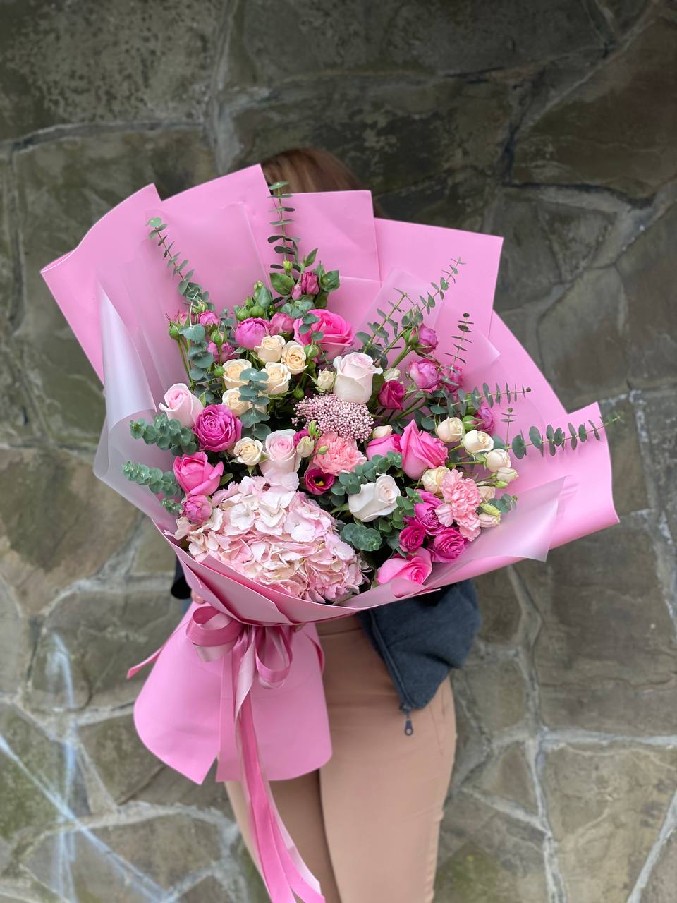 Paulina — это сложная работа с объёмом и воздухом. Гортензия создаёт мягкую основу, а кустовые розы Мисти Баблс и эустома добавляют графичности. Диантус и эвкалипт разбивают плотность, позволяя букету дышать и занимать пространство по-новому.