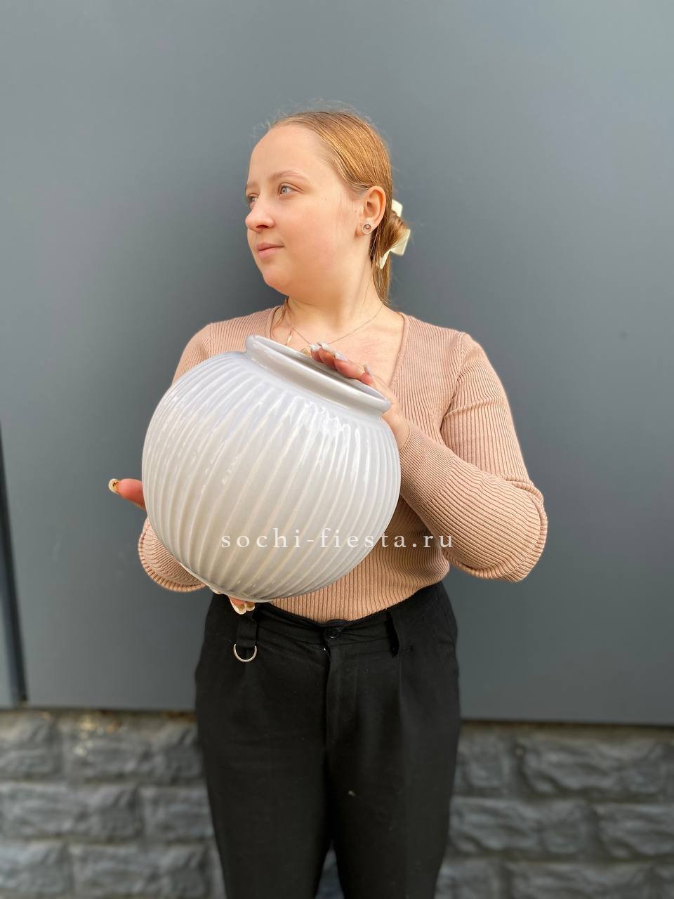 Керамическая ваза с плавными обводами и устойчивым основанием. Объем три литра позволяет разместить объемные букеты с длинными стеблями. Классическая форма дополнит любой интерьер.
