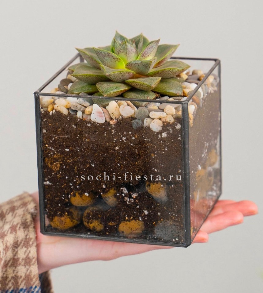 Флорариум Кубик с суккулентом Каменная роза