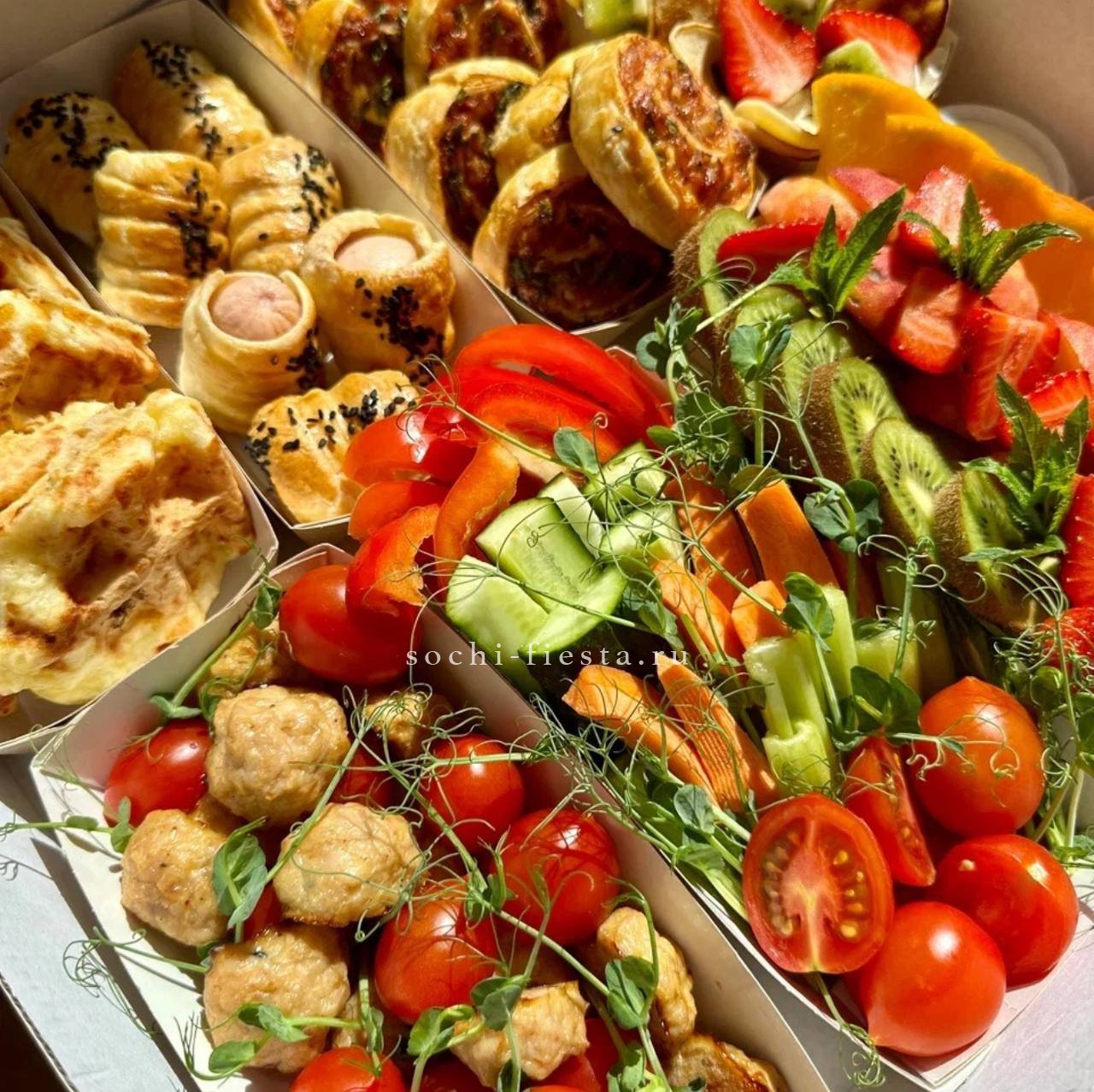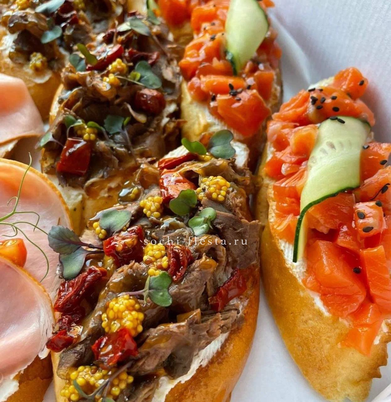 брускетта с голубым сыром и карамелизированной грушей- 3 шт.,  брускетта Цезарь- 3 шт., брускетта сырная с манго-маракуйя- 3 шт.