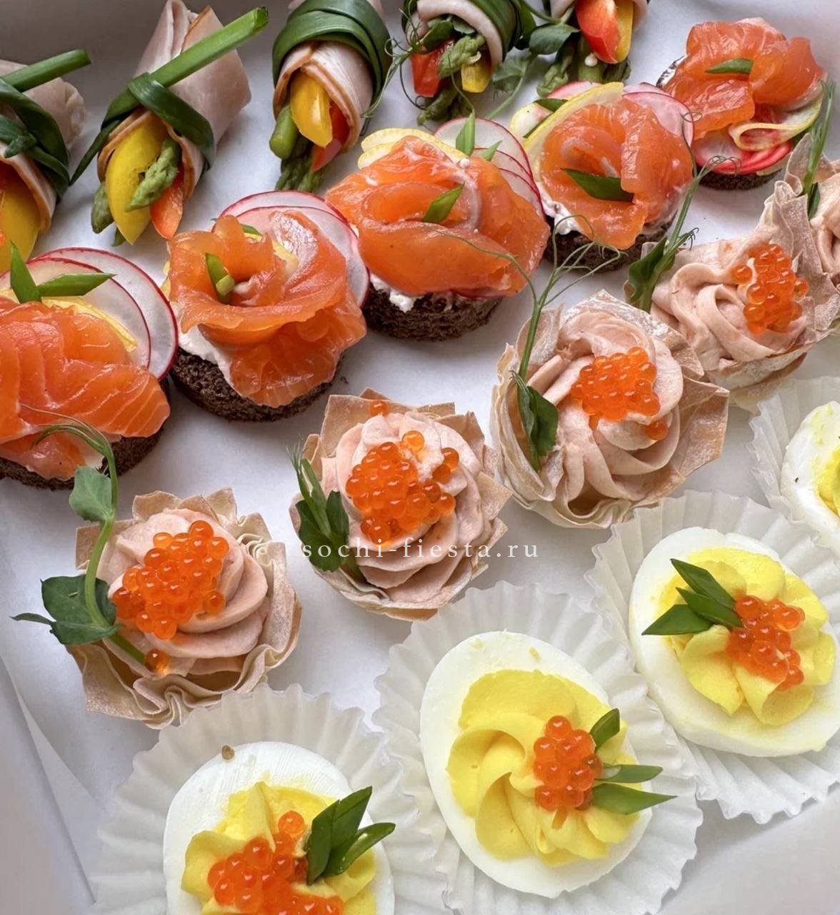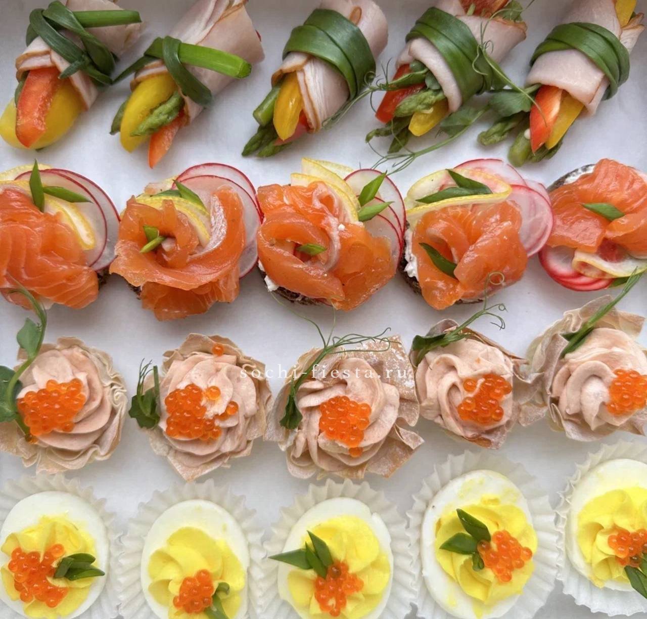 мит боллы- 12 шт. Сырные вафли- 6 шт. Овощная и фруктовая корзинки. Сосиски в тесте- 6 шт. Мини-оладушки- 80 шт. Улитки с ветчиной и сыром- 6 шт.