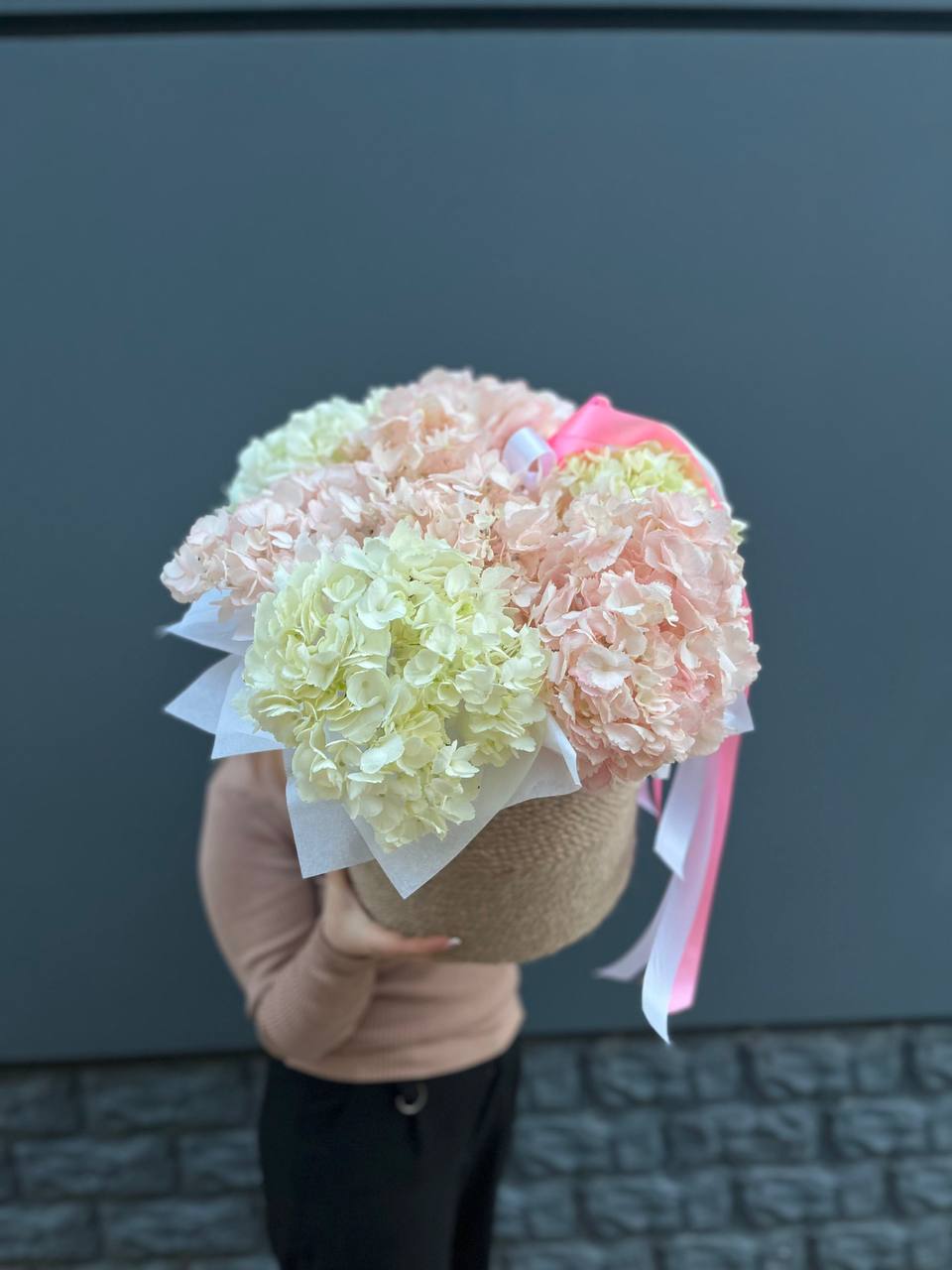 Одно крупное соцветие гортензии в лаконичной подаче. Живое решение для рабочего стола или утреннего чаепития когда хочется свежести без лишнего.