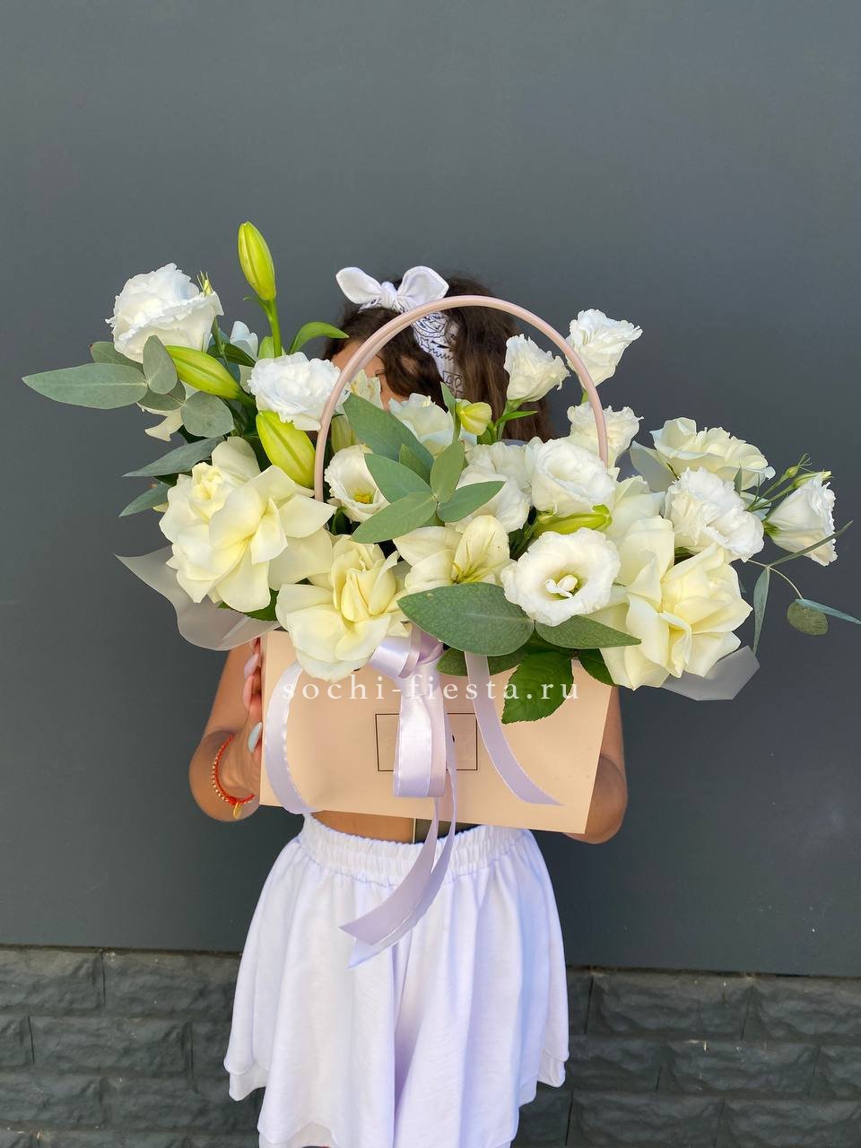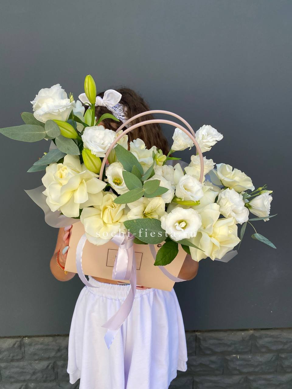 Белые розы и эустомы перекликаются с пастельными соцветиями гортензии, а озотамнус добавляет фактурные акценты. Эвкалипт обрамляет композицию серебристыми нотами.