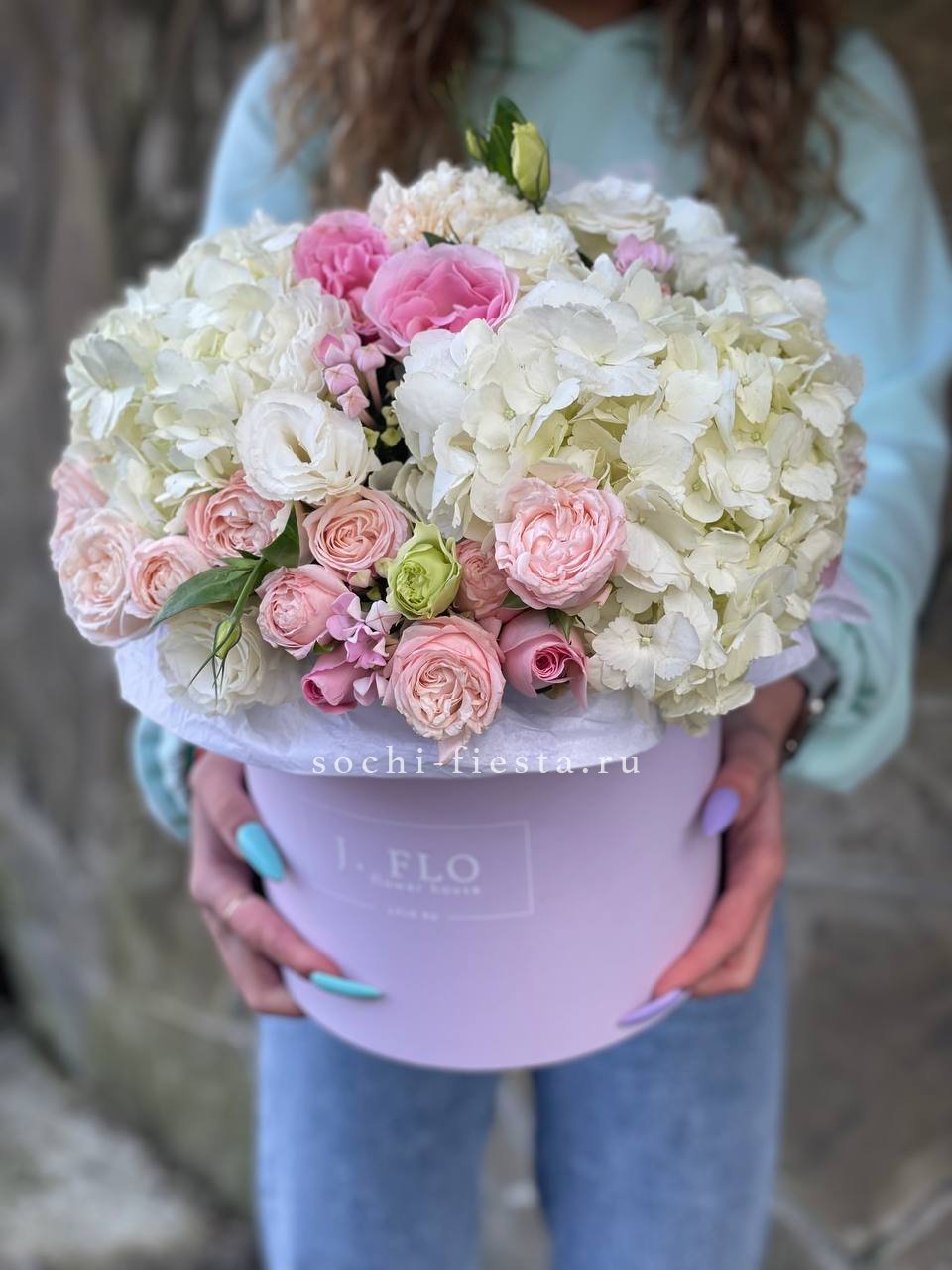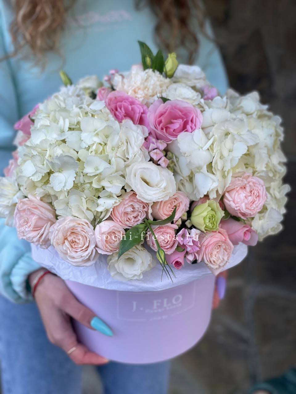Белоснежные розы и воздушная эустома соседствуют с пышной гортензией и яркими вспышками статицы. Композиция собрана плотно, каждый цветок находит своё место в общем ритме.