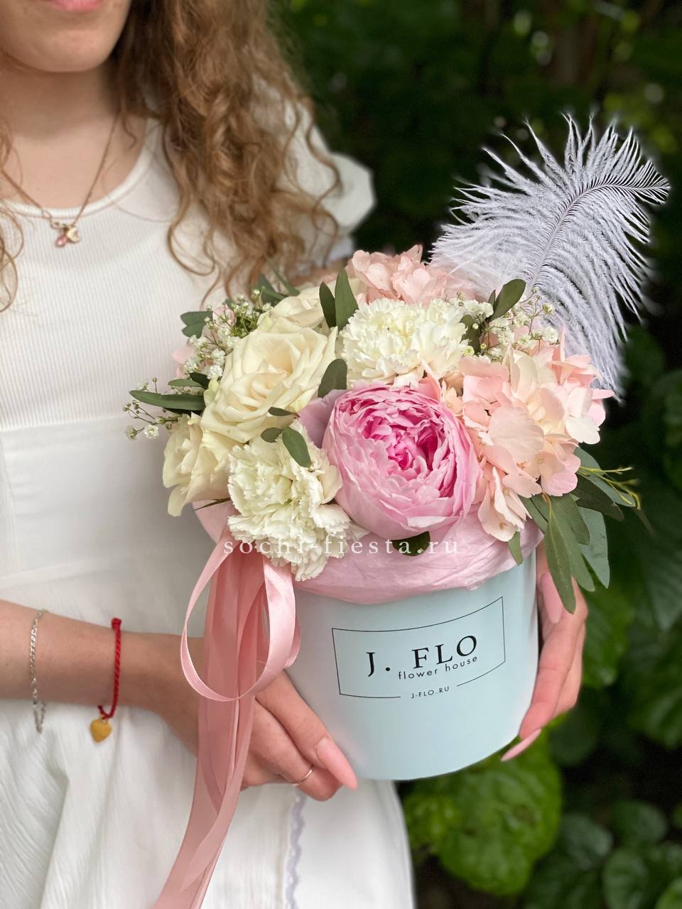 пион, гортензия, розы одноголовые, диантусы, ветка гипсофилы (или замена вне сезона), перо (или аналог по согласованию), эвкалипт, цилиндр D16.