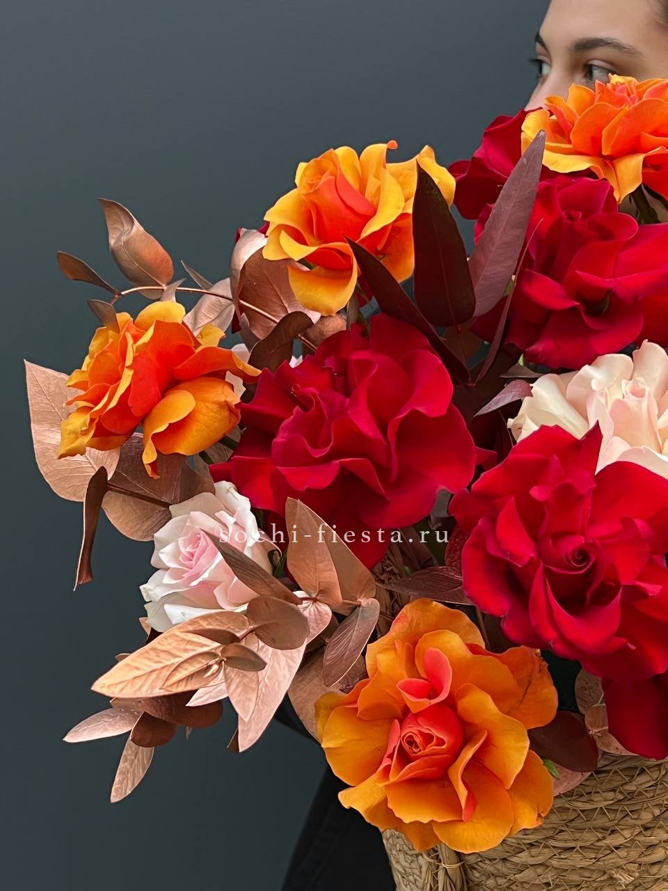 Французские розы собраны в плотную округлую форму и дополнены серебристыми ветками эвкалипта. Натуральное джутовое кашпо придает композиции естественность и законченность.