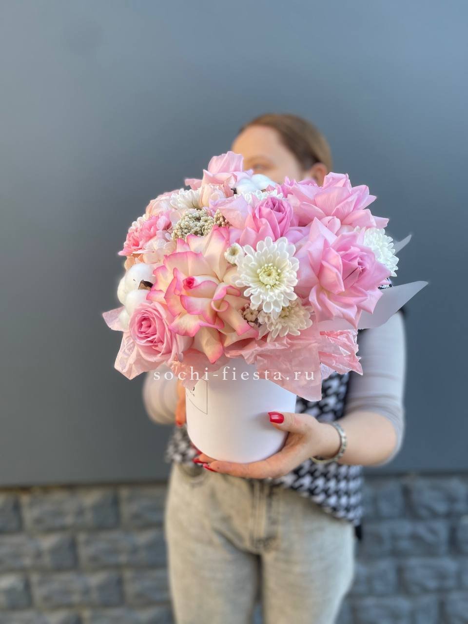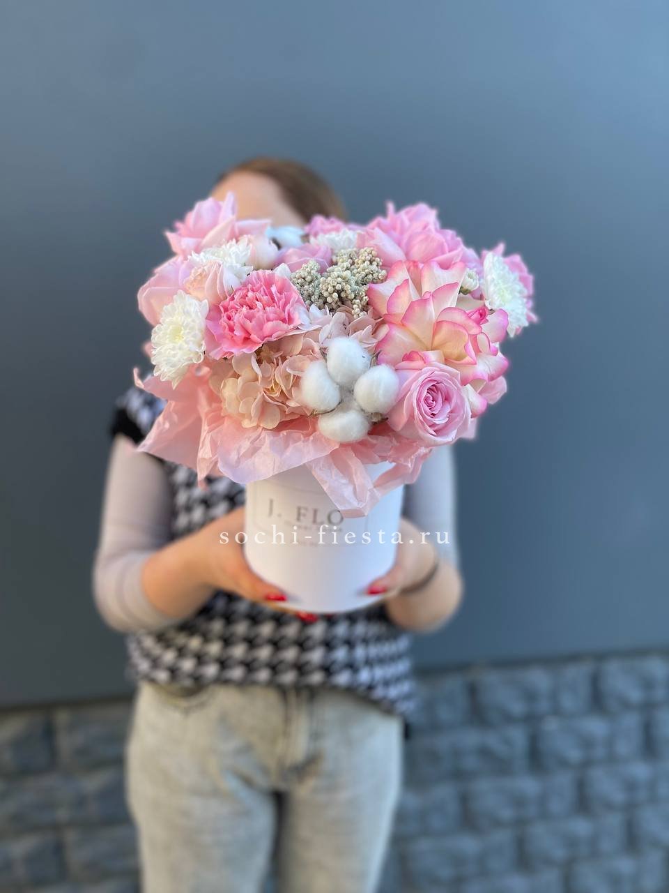 гортензия, розы, озотамус, диантус, бомбастик, хлопок, хризантема бокс 16.