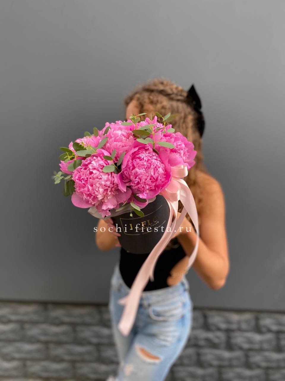 Семь пионов раскрываются пышными шапками в компактном цилиндре. Каждый бутон демонстрирует многослойную структуру лепестков, а эвкалипт обрамляет композицию лёгким серебристым кольцом.