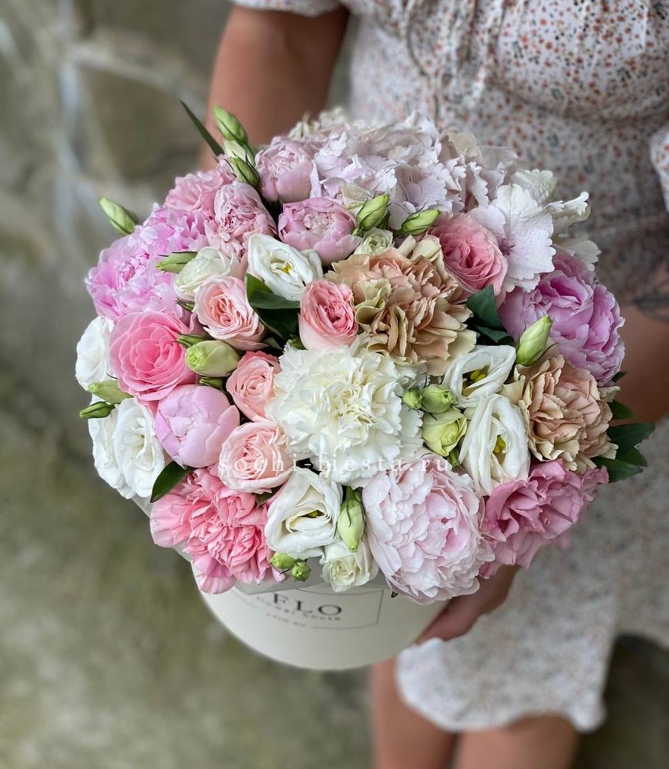 гортензии, розовые розы, маттиола (аналог), эустомы, перо, диантусы,  цилиндр D20, лента, упаковка.