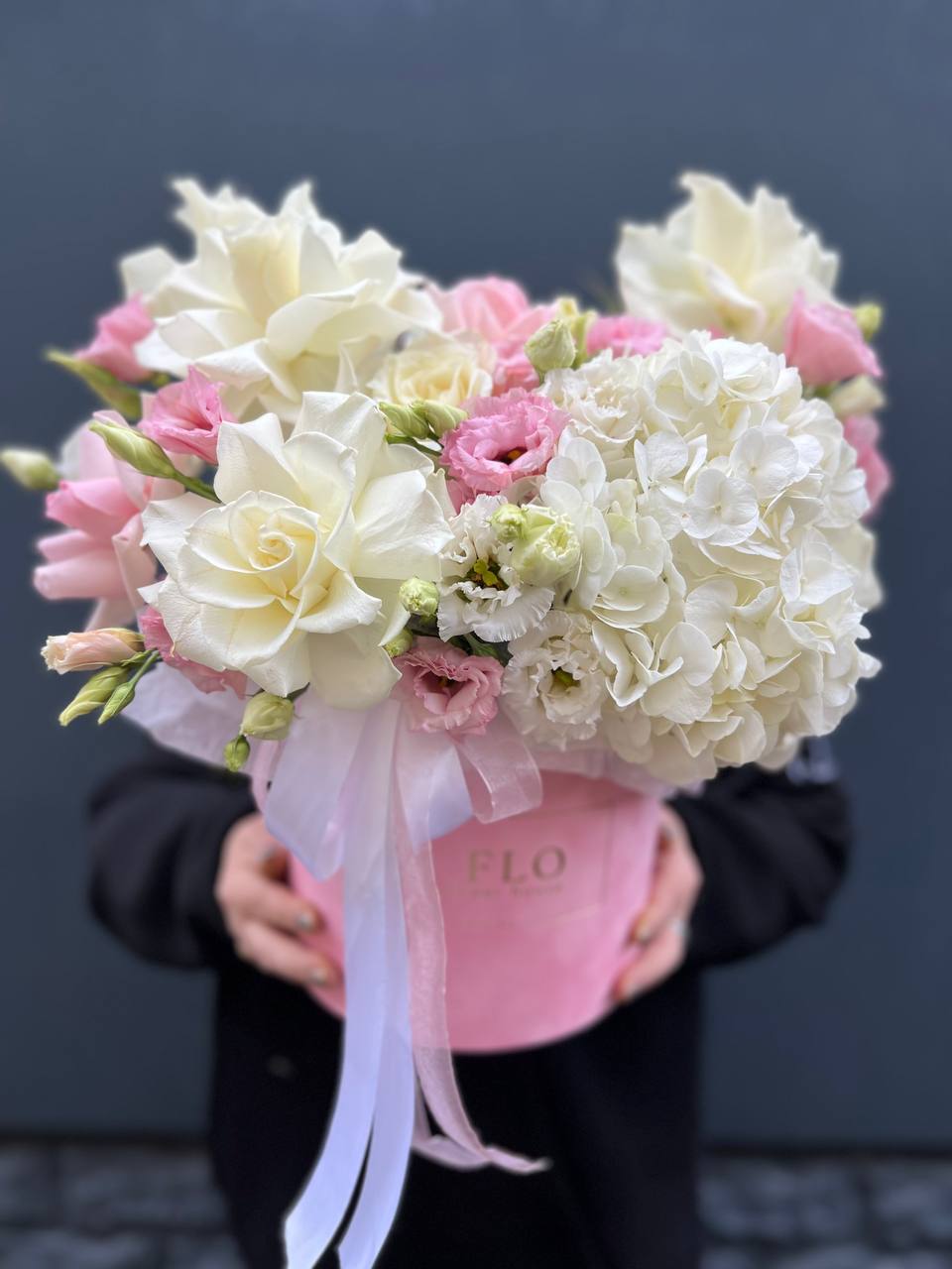 бокс, белая роза, розовая роза, эустома, гортензия, оазис.
