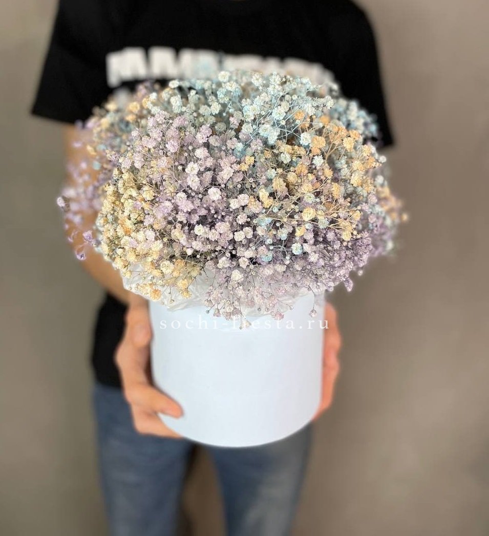 9 Радужных гипсофил в шляпной коробке
