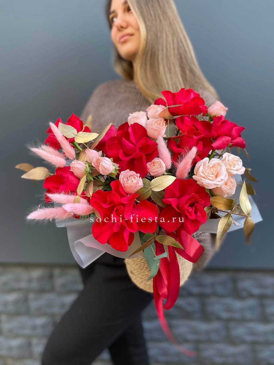 Красные розы и бомбастик выделяются на фоне золотистого эвкалипта и пушистого лагуруса. Тёплая гамма и разнообразие текстур собраны в компактную композицию с выразительным характером.