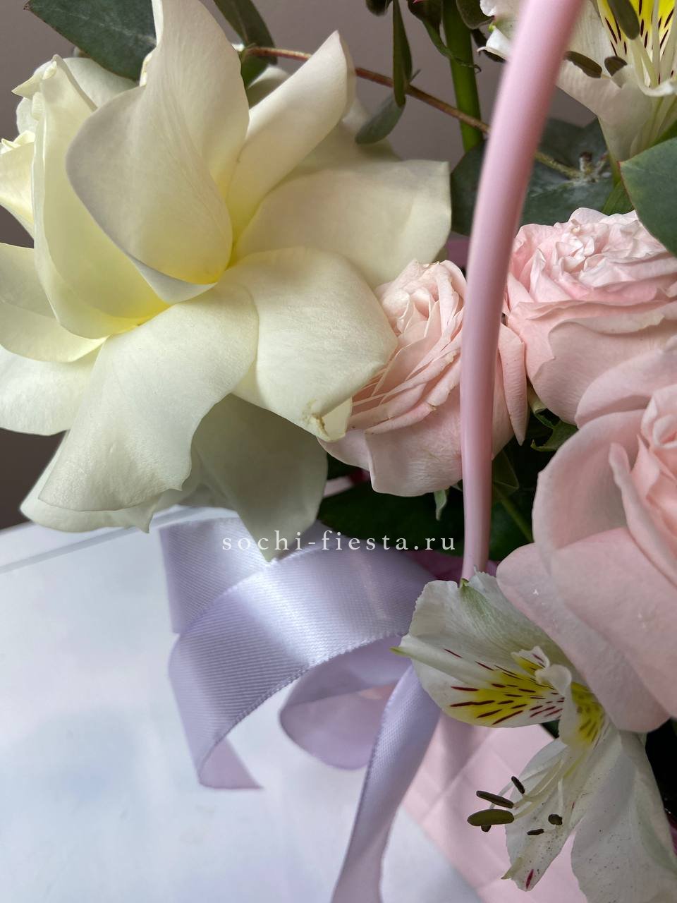 розовая роза, пионовидная роза, диантус, альсромерия, эвкалипт, лента, сумка.