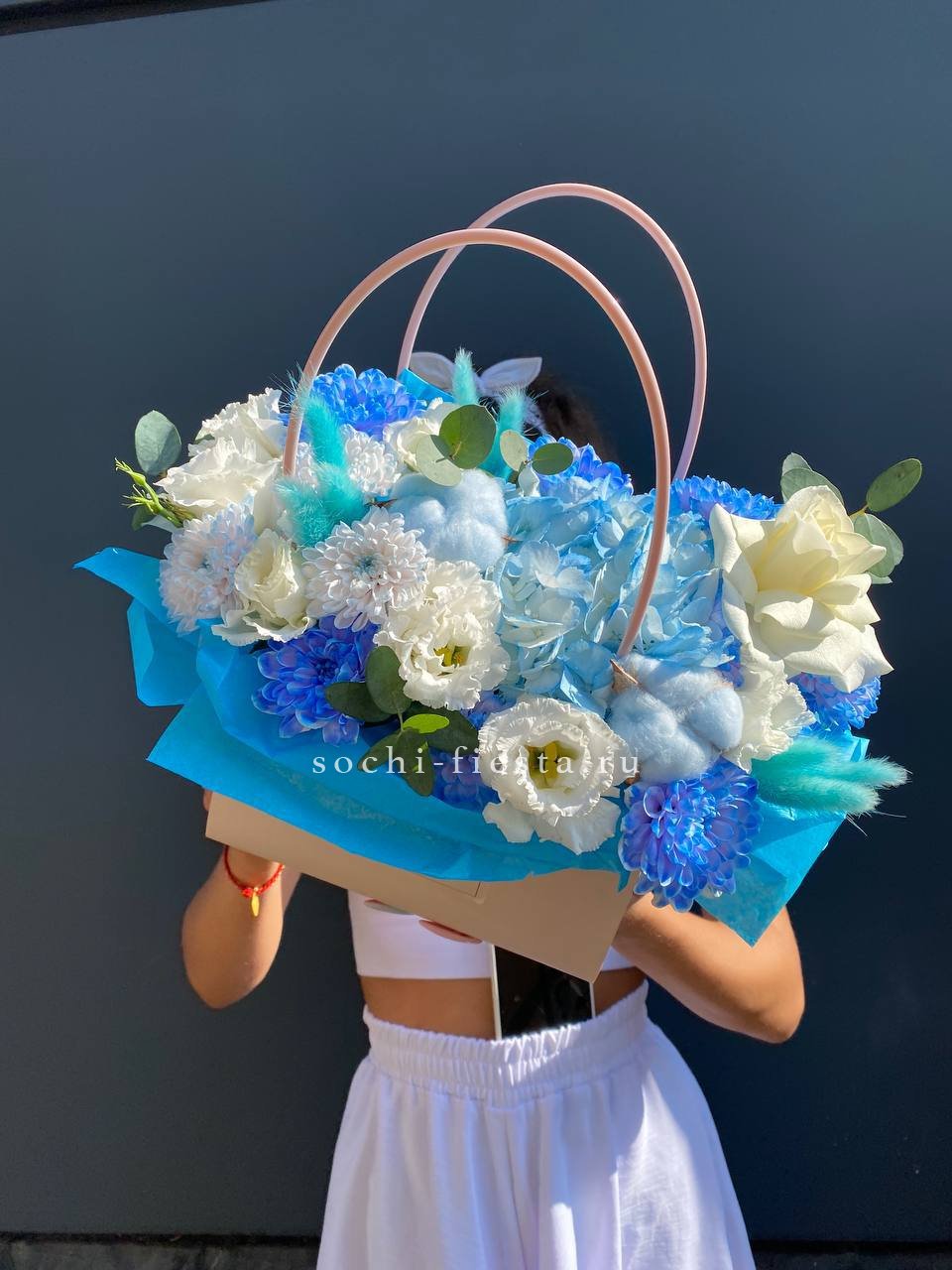 Голубая гортензия задаёт тон всей композиции, где хризантема и эустома создают объём, а хлопок с лагурусом добавляют воздушности. Сумочка вмещает насыщенную палитру без перегруженности.