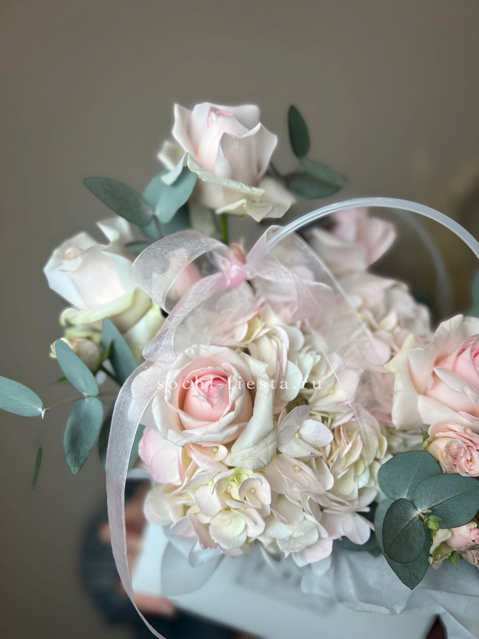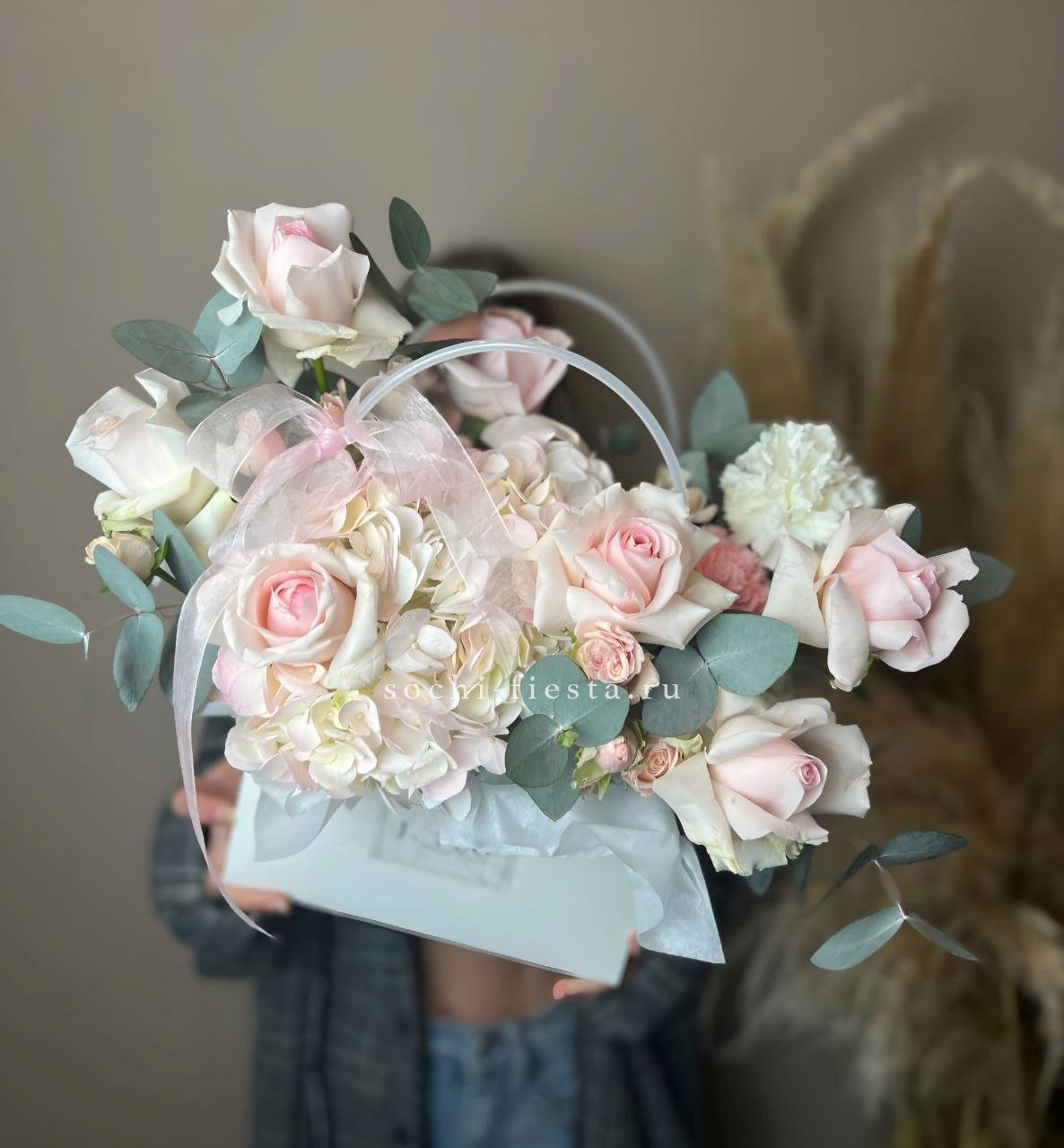 сумочка, хризантема, розовые розы, диантус, эвкалипт.