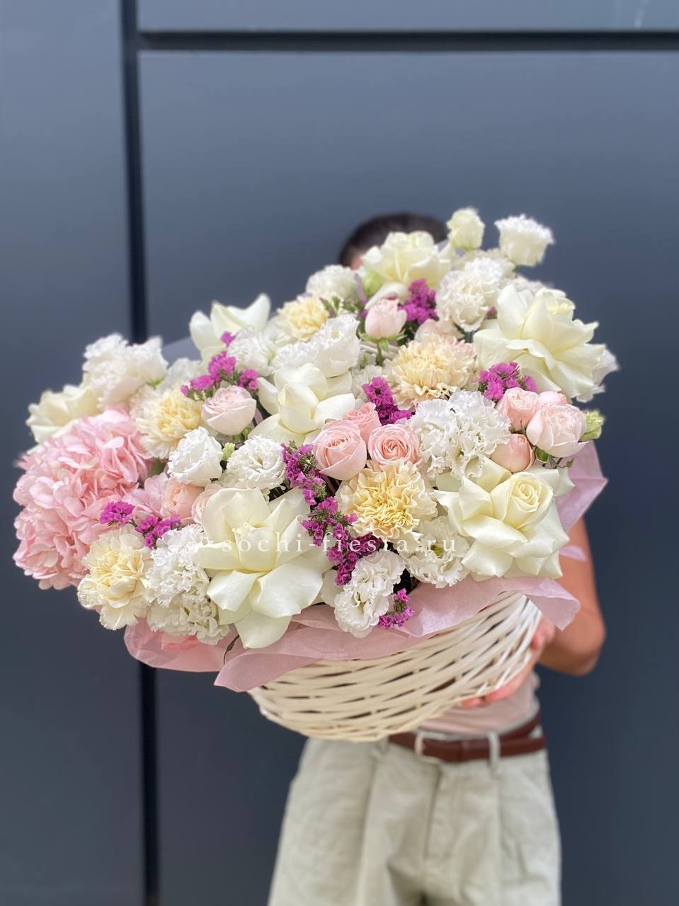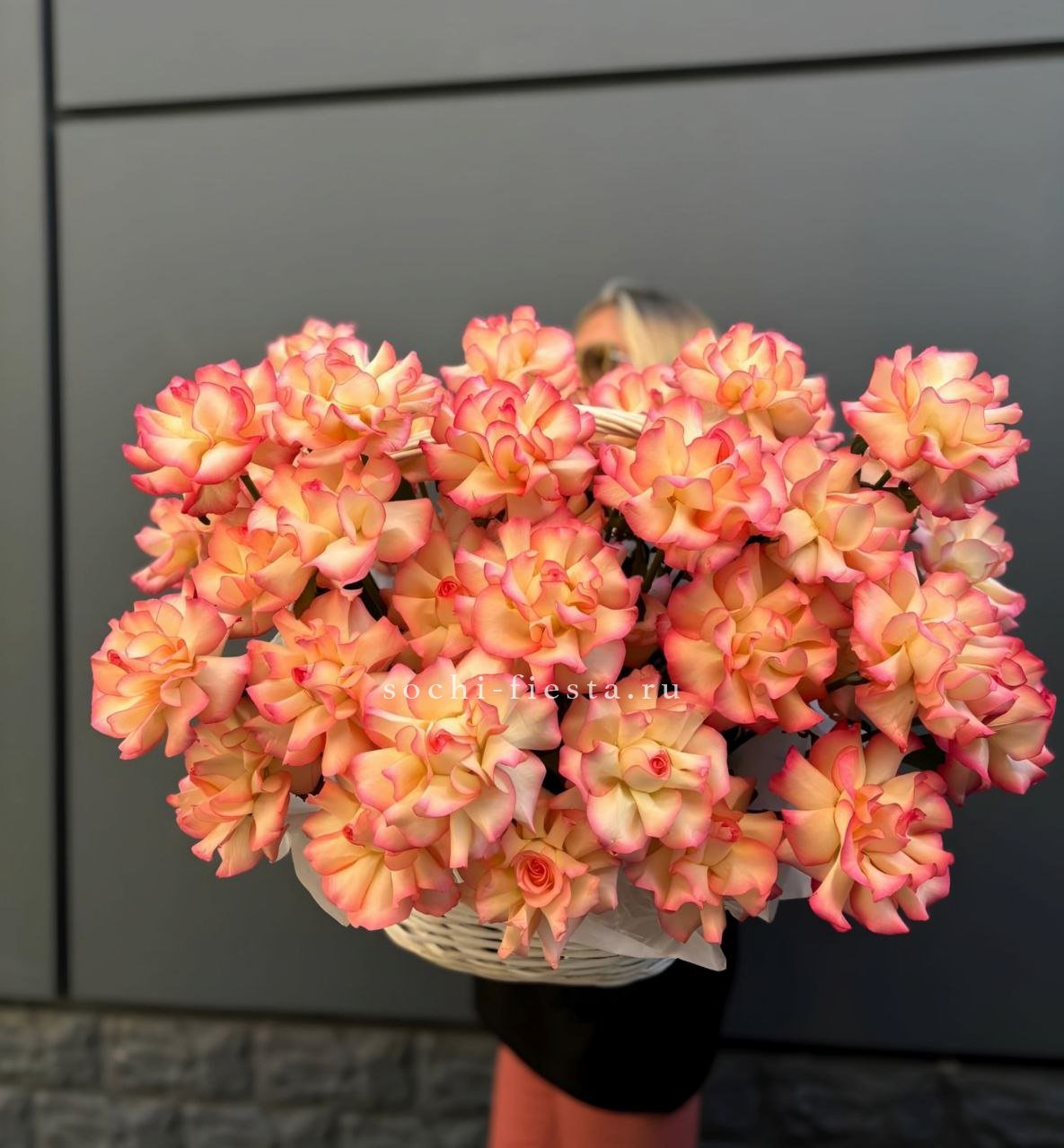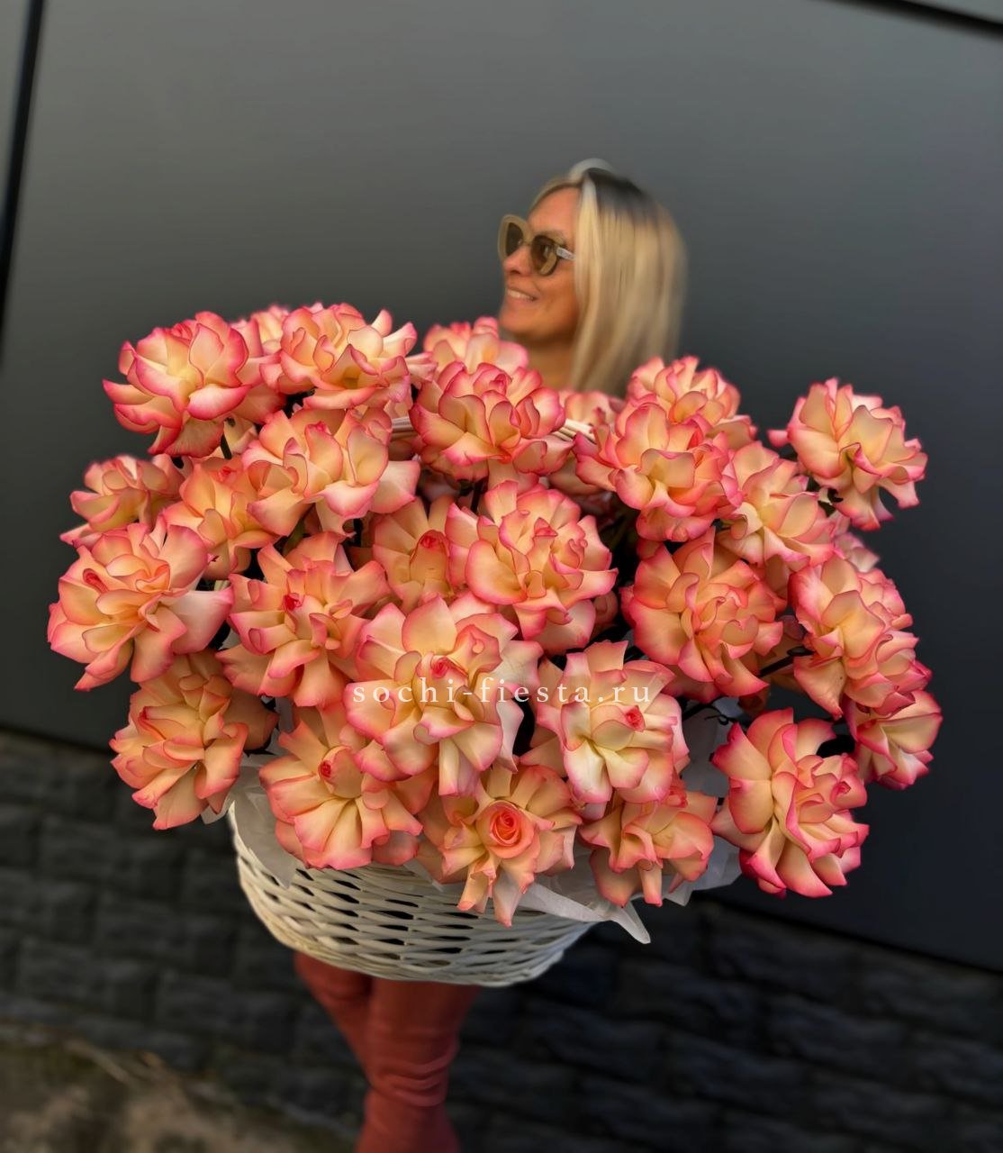 Пятьсот пятьдесят пять роз в корзине с персональной надписью — это целая инсталляция из живых цветов. Объём композиции впечатляет масштабом и создаёт незабываемое визуальное присутствие.