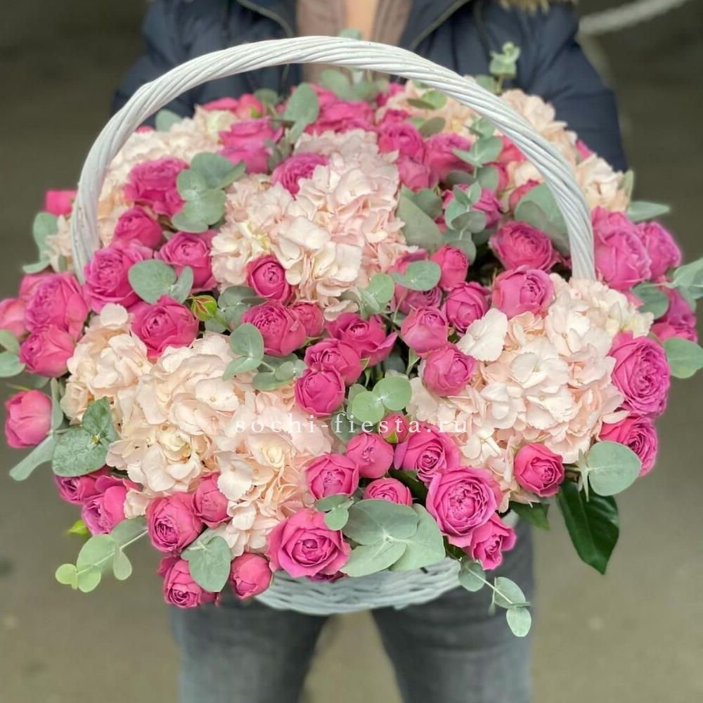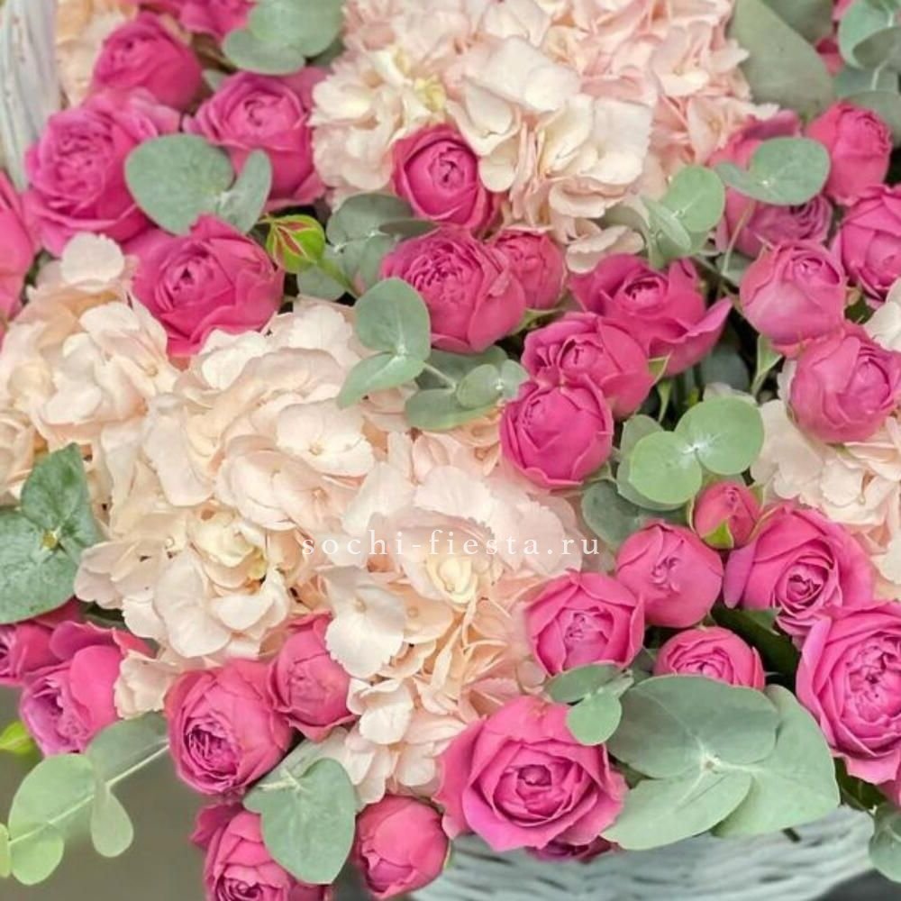 Корзина объединяет гортензии, эустомы, розы и маттиолу в многослойную композицию. Разные фактуры лепестков создают визуальную глубину и насыщенность.