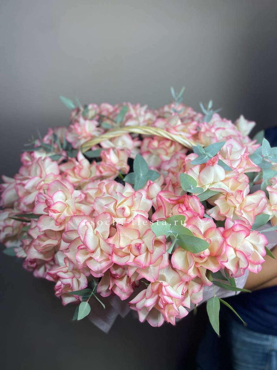 гортензия, эустома, розы, маттиола (дельфиниум или аналоги), кустовые розы, лента, корзина D40.
