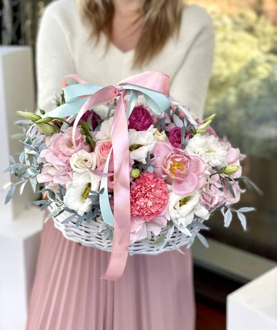 Пышная корзина с французскими розами цвета утренней пудры окружена мягкими ветками эвкалипта. Бутоны собраны плотной шапкой, создавая воздушный объем и насыщенное розовое облако. Композиция удобна для размещения на столе или комоде.