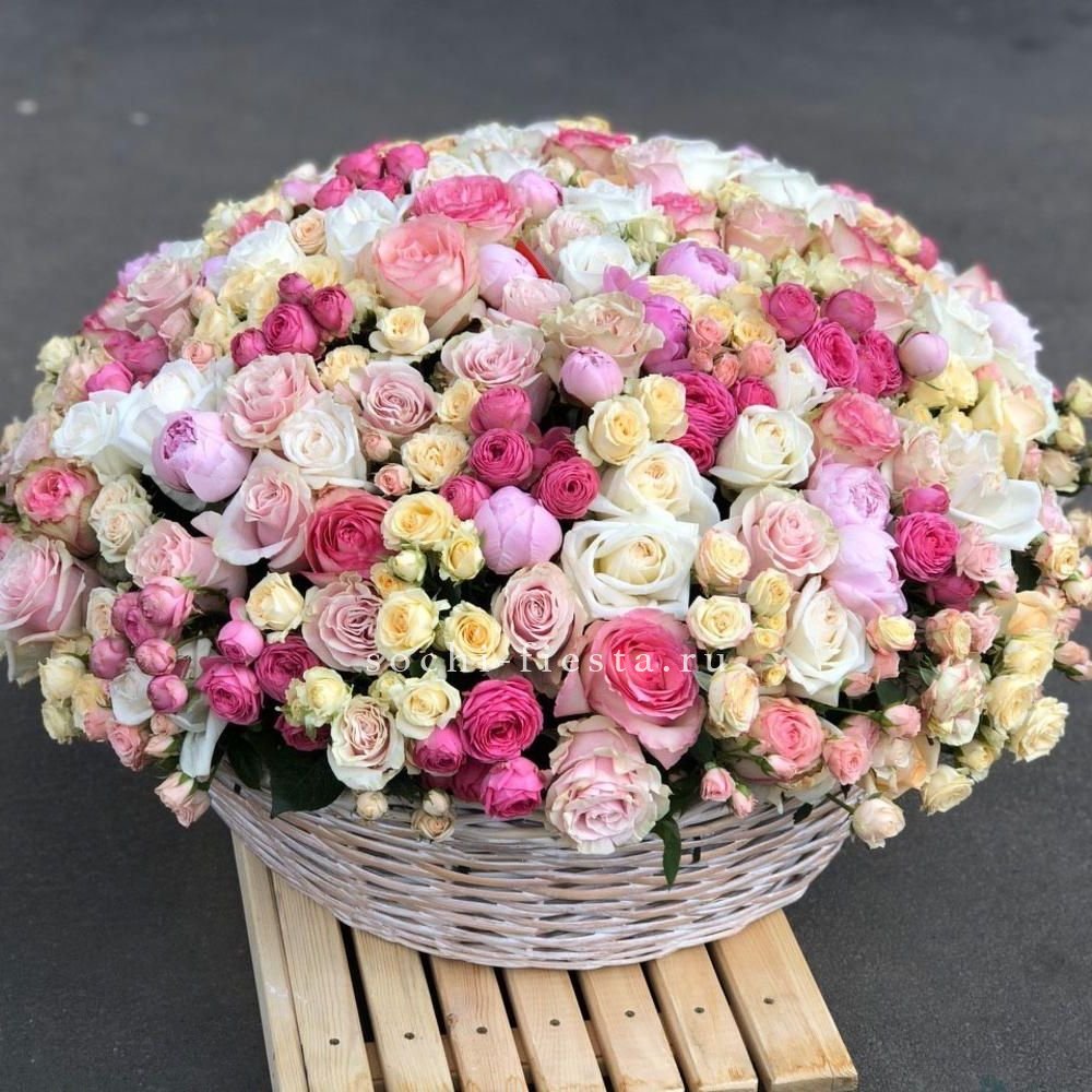роза одноголовая, роза пионовидная, альстромерия, эустома, гортензия, ковыль, диантус, плетеная корзина.