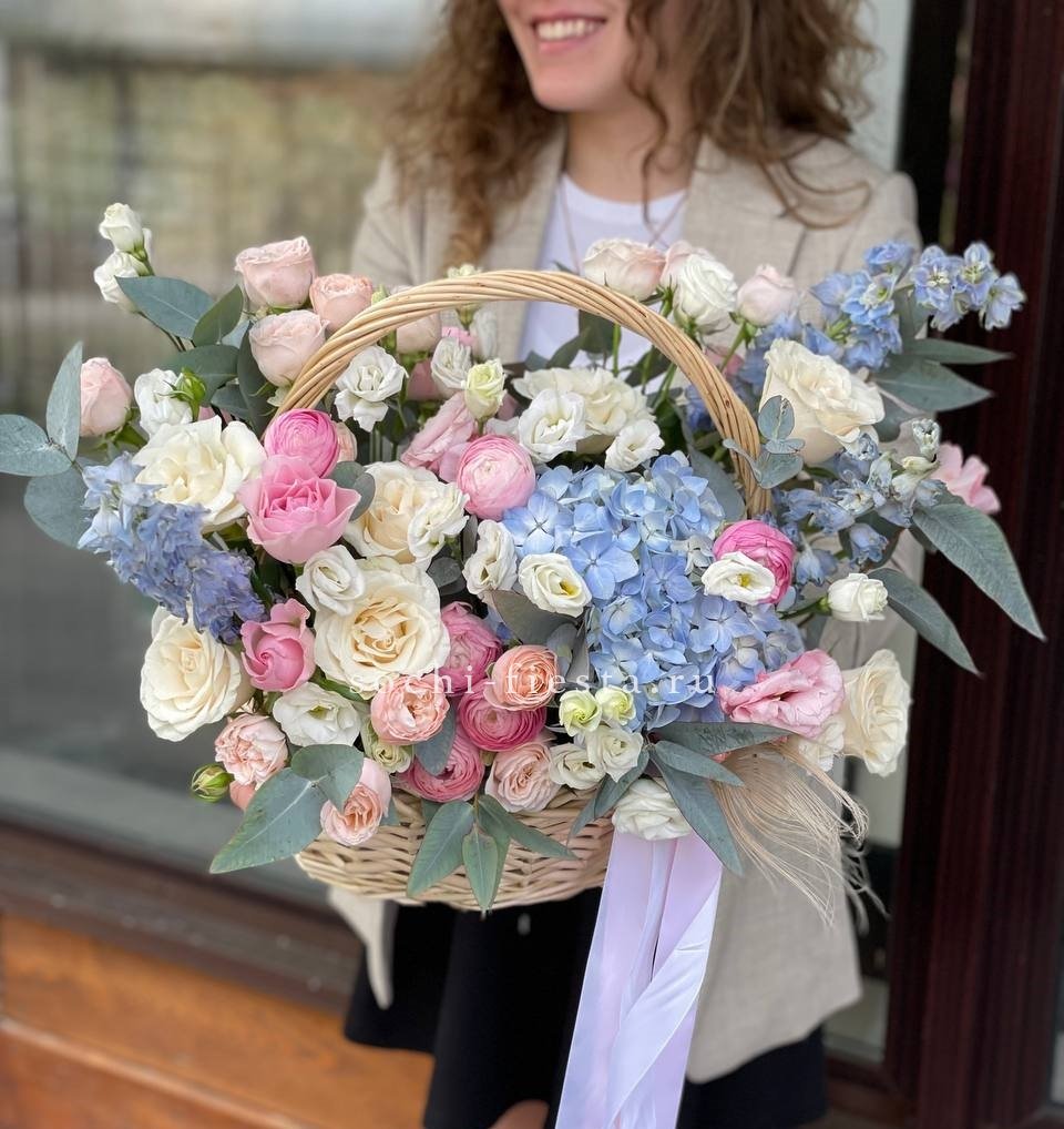 Плотная сферическая форма из пышных бутонов создаёт объёмную композицию в плетёной корзине. Ветки эвкалипта добавляют воздушности между головками цветов. Классическое решение для яркого события или знакового дня в жизни близкого человека.