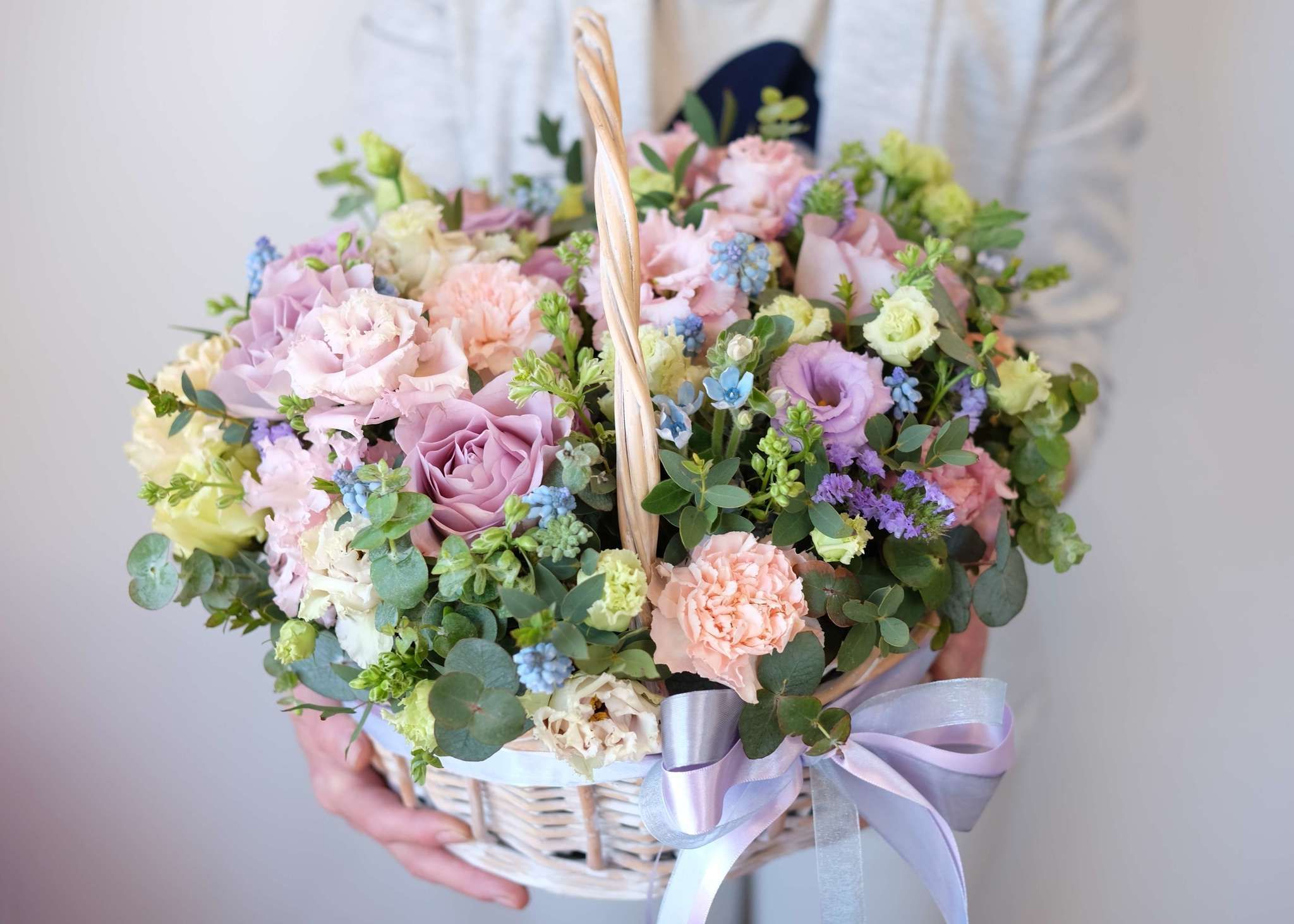 Объёмная композиция объединяет махровые головки пионов и кустовых роз с душистой маттиолой. Цветочная сфера собрана в плетёном боксе и держит форму за счёт плотной укладки бутонов разной степени раскрытия.